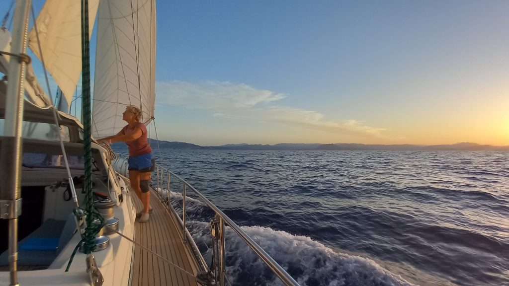 Nach der Schlacht heißt früher Start am nächsten Morgen. Der Marinero kommt sogar extra vor seinem offiziellen Dienstantritt, um unseren Stromverbrauch abzulesen und abzurechnen. Nutzen tut der frühe Start aber nicht. Der versprochene Wind lässt sich zunächst nicht blicken. Zwei, drei Stunden später oder so weht es doch ein bisschen. Nur die Richtung ist blöd. Exakt von hinten. Anke möchte daher die Genua ausbaumen. Das bedeutet viel Arbeit, zumal wir unseren Spi-Baum so gut wie noch nie benutzt haben und uns die Übung fehlt. Aber sie hat recht, wir müssen das mal üben.