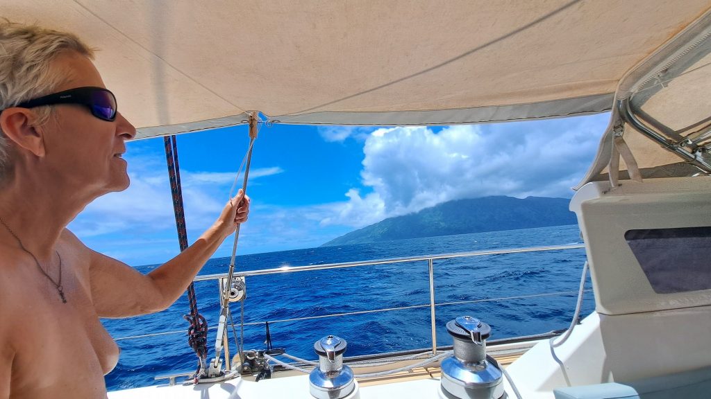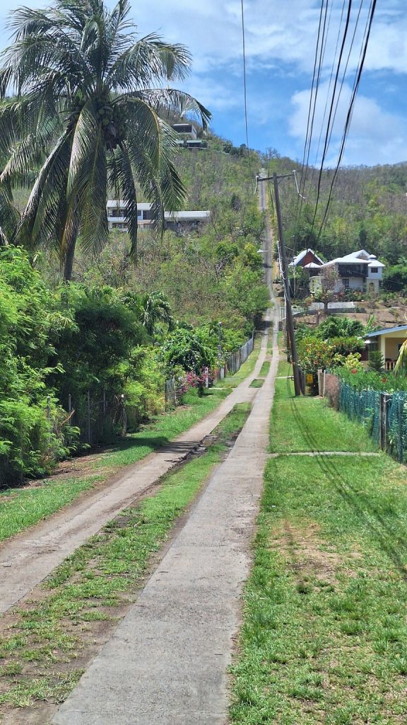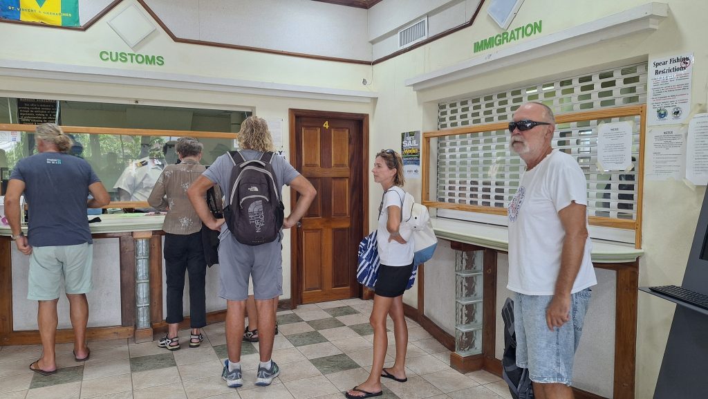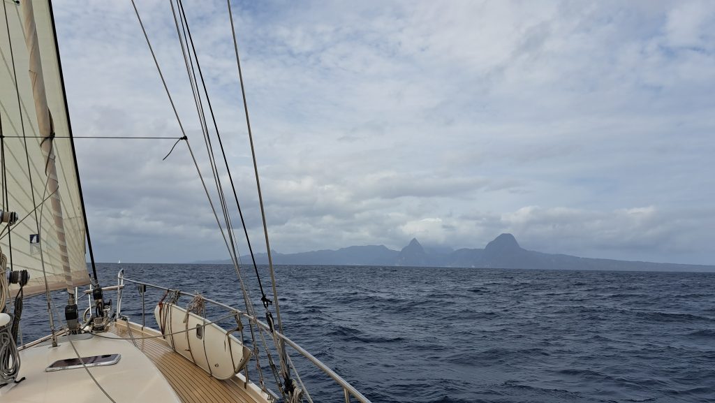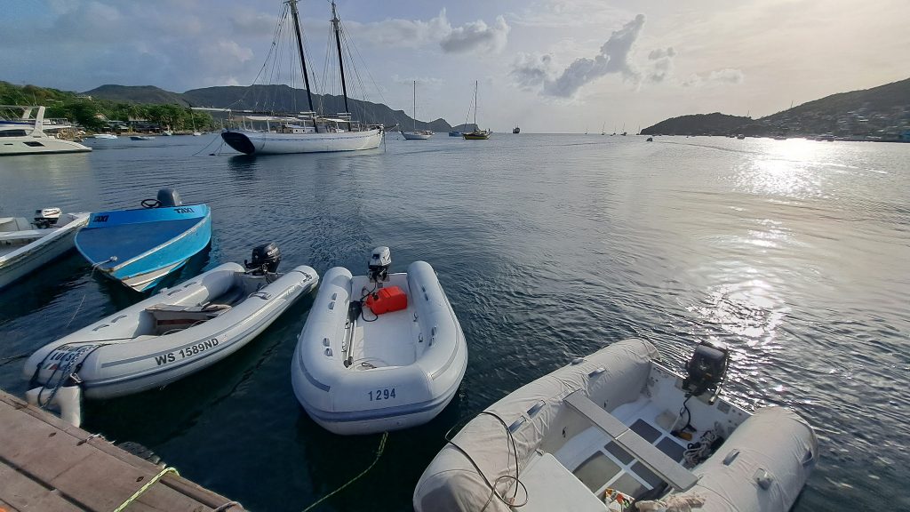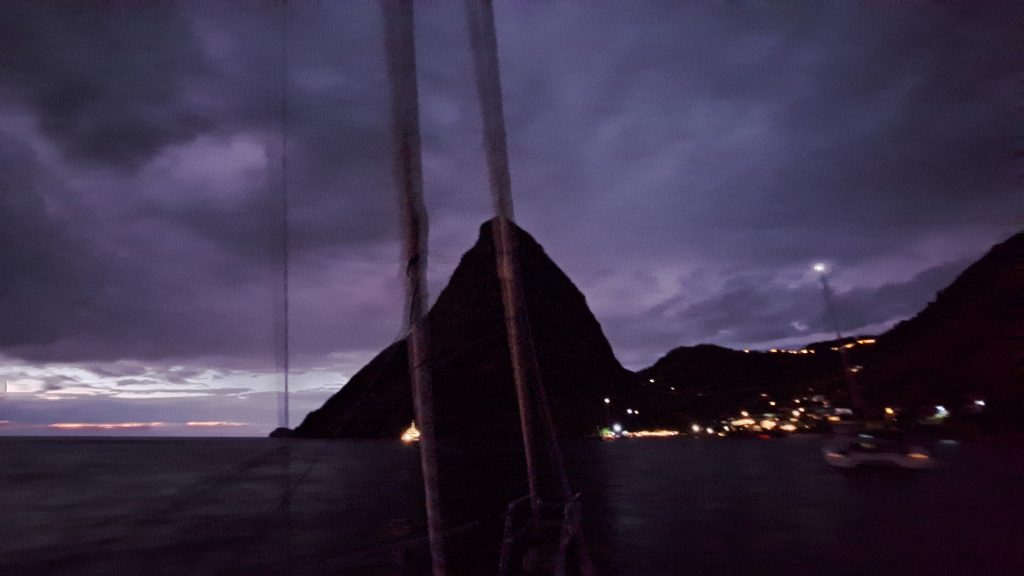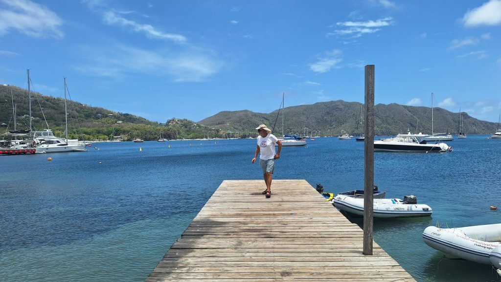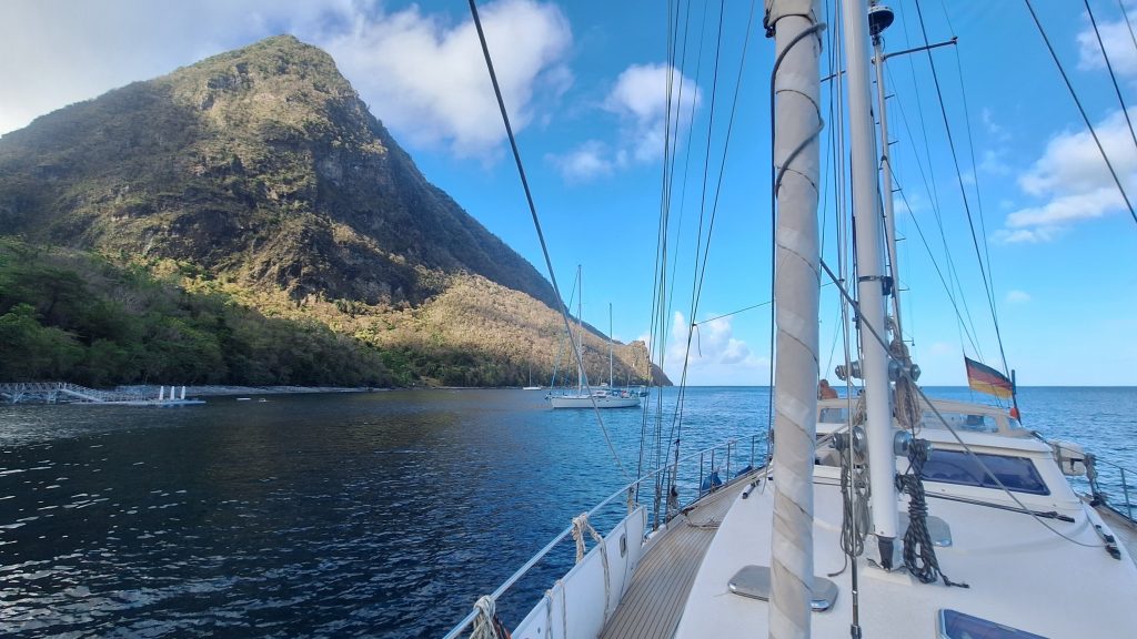 Ankern unter dem südlichen der beiden Pitons. Der gruselige Regen (s. →https://www.sy-magodelsur.de/2025/05/26/marigot-bay/) hat am Ende des Tages endlich nachgelassen. Am nächsten Morgen sieht die Welt gleich freundlicher aus. Blick gen Süden – der Gros Piton befindet sich hinter uns 😉Mitten in der Nacht hatte etwas gerummst. Martin ist aus der Koje und konnte verblüfft feststellen, dass ein Boot längsseits an Magos Rumpf lag. Ungefendert! Kein Mensch an Deck. Erst nach langem Rufen und energischem Klopfen zeigten sich zwei Helden der Seefahrt. Der Knoten (?), mit dem sie ihr Boot an einer Muring befestigt hatten, hatte sich gelöst und das Boot war abgetrieben. Hat ziemlich gedauert, bis Martin die beiden soweit hatte, dass sie endlich die Maschine starteten und an ihre Boje zurückkehrten. Sie glaubten glatt, wir wären auf sie drauf gedengelt. Hier ein Foto der Übeltäteryacht. Und Glück bedeutete es sowieso, dass sich ihr Boot an unseres gelegt hatte. Denn einer der nächsten potentiellen Anlehnmöglichkeiten wären die Felsen vor dem Petit Piton gewesen.Es folgt schönes Segeln (mit gelegentlichem Motoren) …… bis die Admiralty Bay, der große Ankerplatz vor dem Hauptort Port Elizabeth, erreicht ist. Wenn man ehrlich ist, viel mehr als den Ort Port Elizabeth gibt es auch nicht. Schließlich hat die Insel nur rund 5.000 Einwohner, das ist knapp die Hälfte der Einwohnerschaft von Worpswede (wo der Bürgermeister alles daran setzt, über die 10.000 zu kommen 😊 warum wohl 😉).Erstmals angelandet. „Protokollarische“ Pflichten stehen an. Und wer sich wundert – die notwendigen Papiere hat Anke, die Fotografin, im Rucksack auf dem Rücken.Auf geht´s, wir wollen keine Pflichten versäumen.