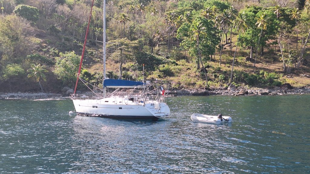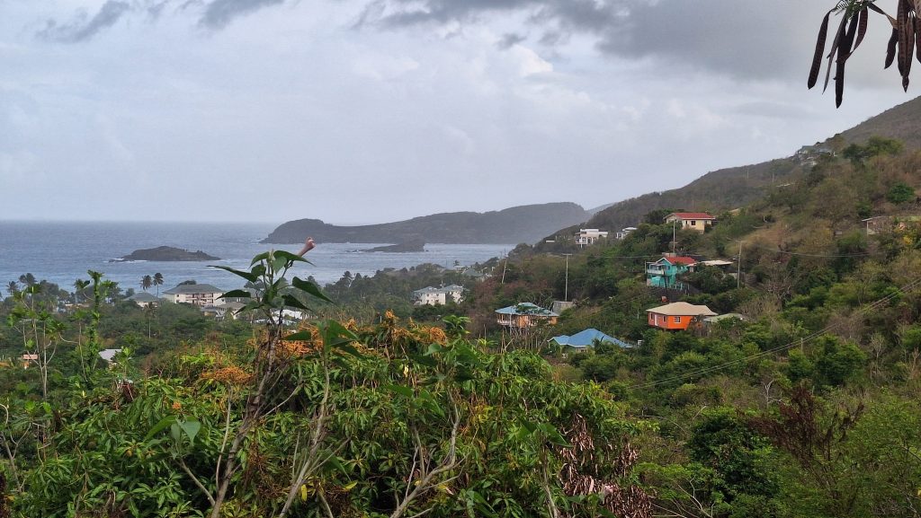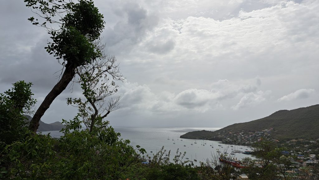 Nach einer nebligen, sehr nassen und unruhigen Nacht vor dem südlichen, dem größeren Gros Piton von Saint Lucia hatten wir die Hauptinsel Saint Vincent einfach übersprungen und waren gleich nach Bequia durchgesegelt. Bei etwas über 50 Seemeilen Distanz kein wirkliches Problem. Das sehr grün wirkende St. Vincent grüßte uns mit dem Duft von Holzfeuern. Ab und zu mussten wir mit dem Motor schummeln, da der Wind in der Inselabdeckung immer mal wieder ausblieb. Als wir dann schließlich vorbei waren, mussten wir hart an den Wind, aber Bequia ließ sich immerhin noch so gerade anliegen. In der großen Bucht vor dem Hauptort Port Elizabeth fanden wir beim zweiten Anlauf einen etwas rumpeligen Ankerplatz. Der Anker war unter einen alten, abgestorbenen und irgendwie losen Korallenblock geraten, der ihm im Lauf der nächsten Tage beim Eingraben half. Die Idee, noch ein wenig weiter nach Süden in die Grenadinen zu gehen, verwarfen wir schließlich. Einerseits wegen des regnerischen und trüben Wetters, andererseits wegen der zu erwartenden Wetterentwicklung. Wir mussten ja wieder zurück nach Martinique, um dort die Anfertigung des Geräteträgers vornehmen zu lassen. Woran der aufmerksame Leser nun erkennt, dass wir einen Zeitsprung in die jüngere Vergangenheit machen.