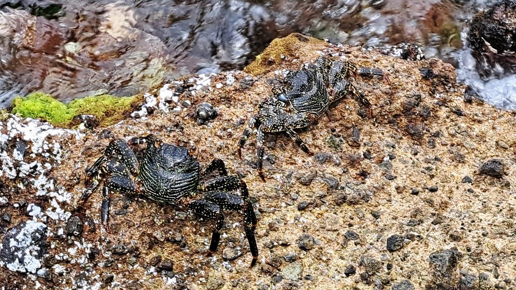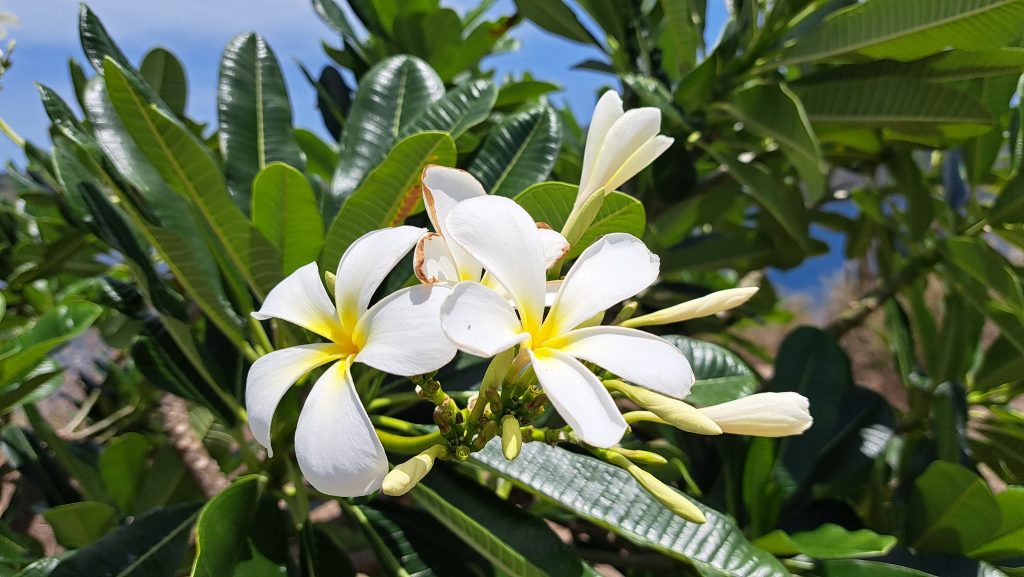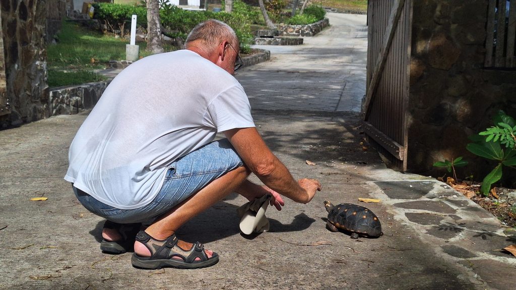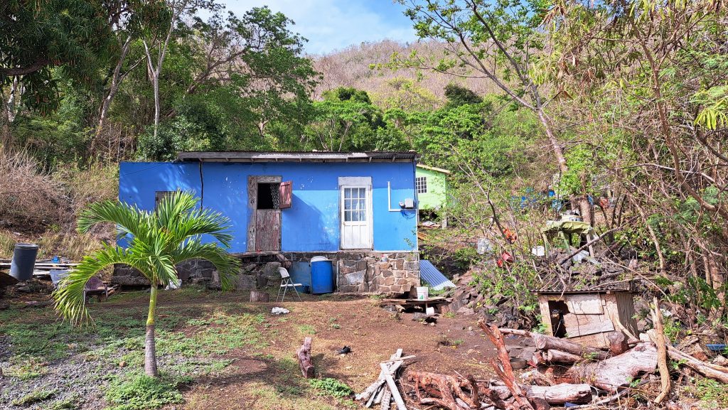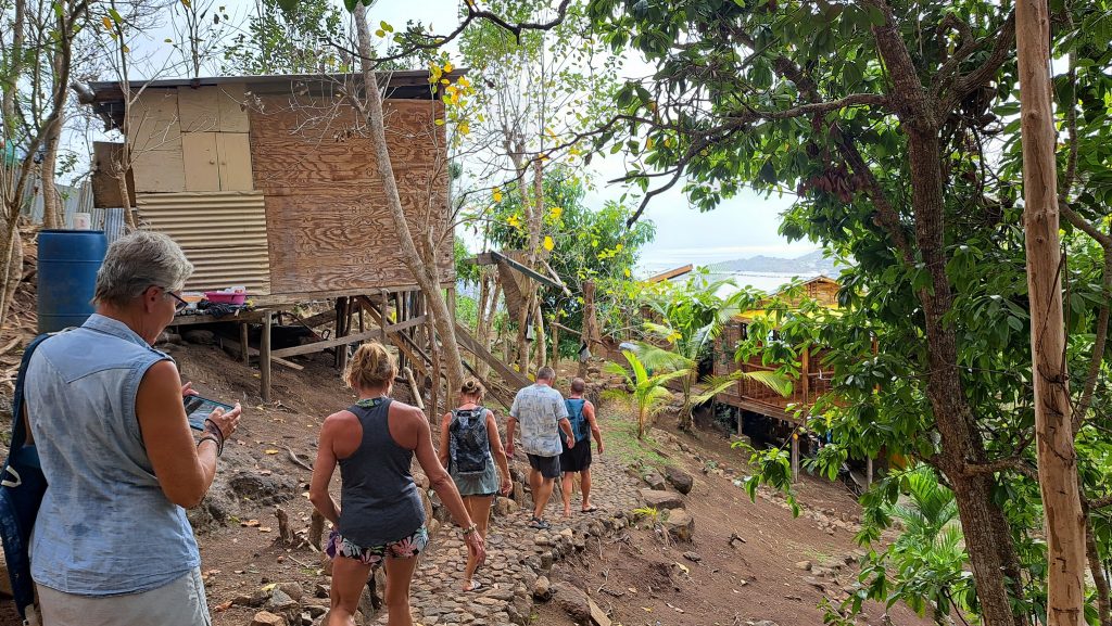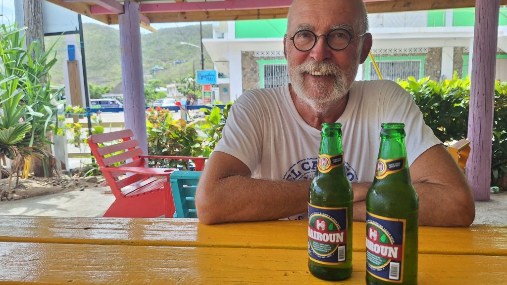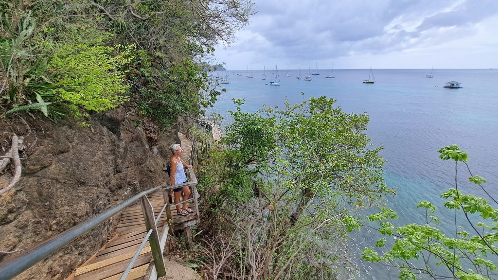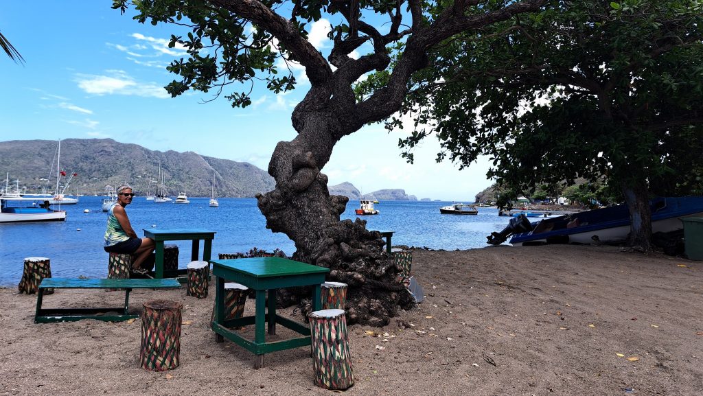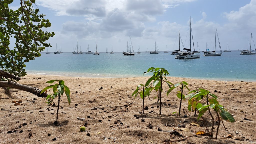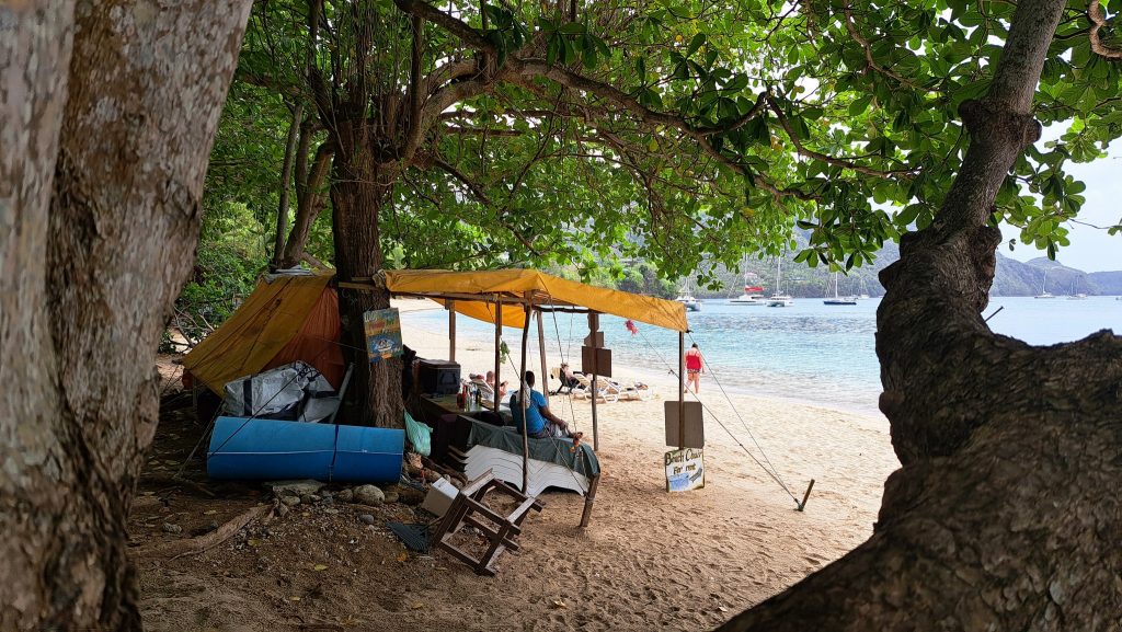 Wieder auf unserer Seite begeistern wir uns für den Uferwanderweg. Bei dem kleinen schwimmenden Häuschen rechts im Bildhintergrund handelt es sich um eine gelegentlich sogar geöffnete Floating Bar.Einfache Strandbars sind öfter zu finden, mal mehr … … mal weniger rumpelig.Und nach einem letzten Blick auf die zahlreichen, aber auf den ersten Blick kaum sichtbaren Krabben …… und ein paar an Tiare erinnernde Blüten brachen wir auf, um nach Martinique zurückzukehren. Schließlich warteten dort weitere Batterien, Solarkollektoren und der Geräteträger sollte ja auch entstehen.Martin trotzt entschlossen der Wärme – normalerweise stöhnt er.St. Vincent ist passiert, wir steuern St. Lucia an. In der Marigot Bay ist mal wieder ein Zwischenstopp geplant.