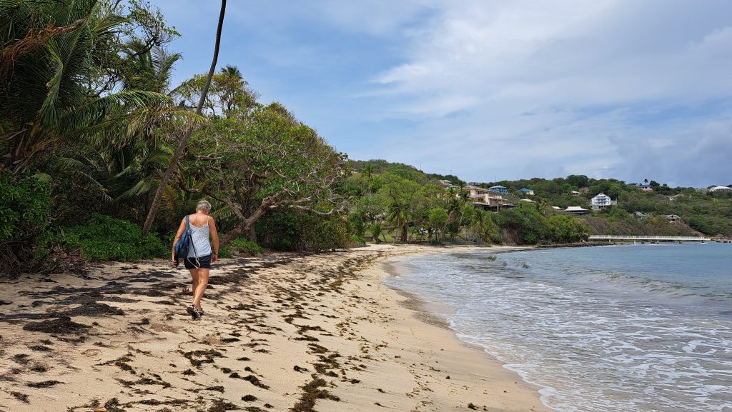 Blick über die Admiralty Bay. Der niederschlagsreiche Sommer kündigt sich täglich aufs Neue an.Ein anderer Tag. Auf dem Weg über den Berg auf die andere Inselseite. Über den Berg im Wortsinne natürlich. Man kann sich hier und da des Eindrucks nicht erwehren, dass es vor 100 Jahren auch nicht viel anders ausgesehen hat.Wir haben die „Paßhöhe“ überschritten. Südküste von Bequia und ein paar der vorgelagerten Inselchen.Martin im Zwiegespräch mit Erna, so haben wir dieses Tierchen getauft.ErnaAuf der anderen Seite der Insel. Auch ein Strand.