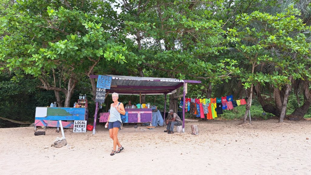 Von der Kneipe hat man eine schöne Aussicht über die Admiralty Bay. Man beachte die bloßen Füße!