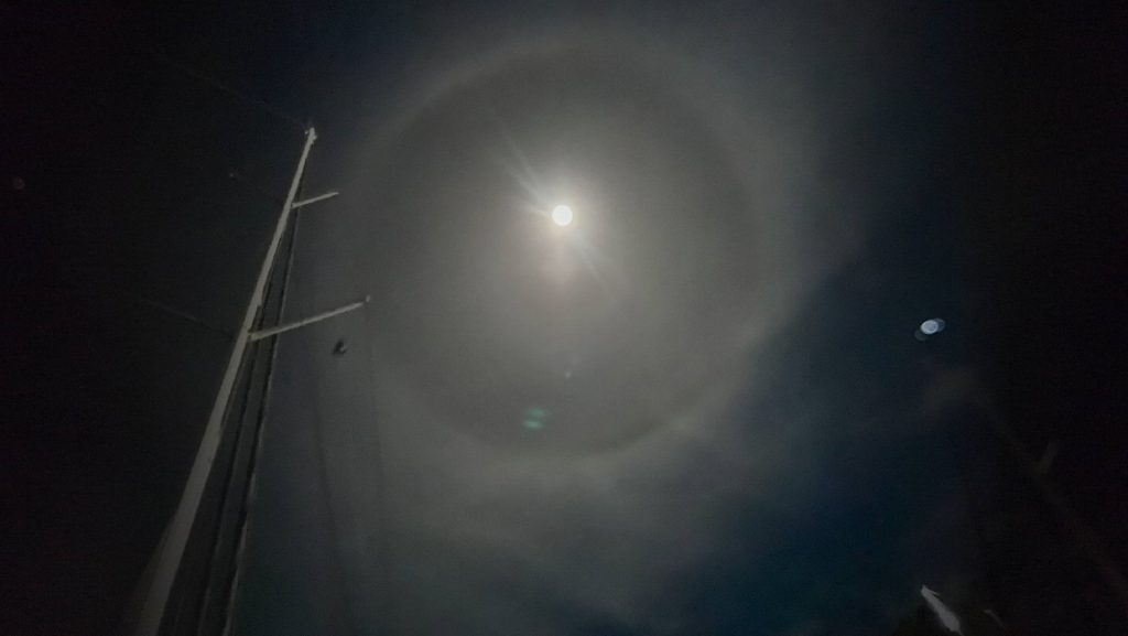 Die Marigot Bay auf Saint Lucia ist unser Absprungsort nach Bequia. In der letzten Nacht, die wir dort gemeinsam mit Cindy und Robert verbringen, erleben wir einen eindrucksvollen Vollmond mit Halo. (Fotomontage unter Verwendung eines Fotos von Anke und eines Fotos von Robert Giroux)