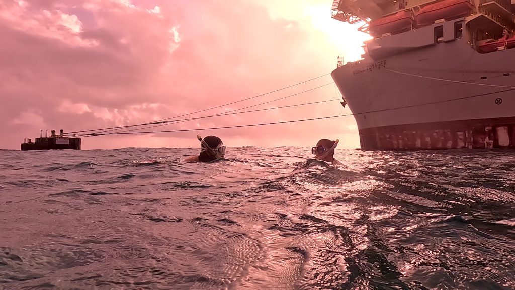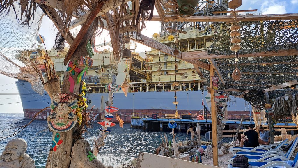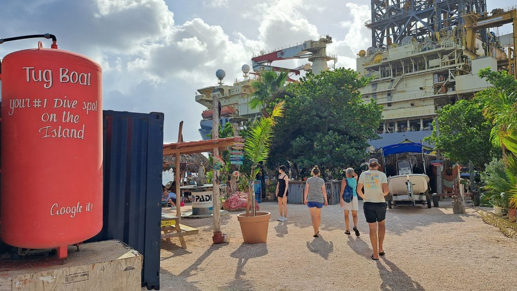 Liegestühle, Bar, Tauchanbieter, Strand, Anleger und Erkundungs- und Bohrschiff – alles in unmittelbarer Nachbarschaft. Für jemand, der im Ruhrgebiet sozialisiert wurde (Martin), ist das etwas, was geradezu Heimatgefühle auslöst.