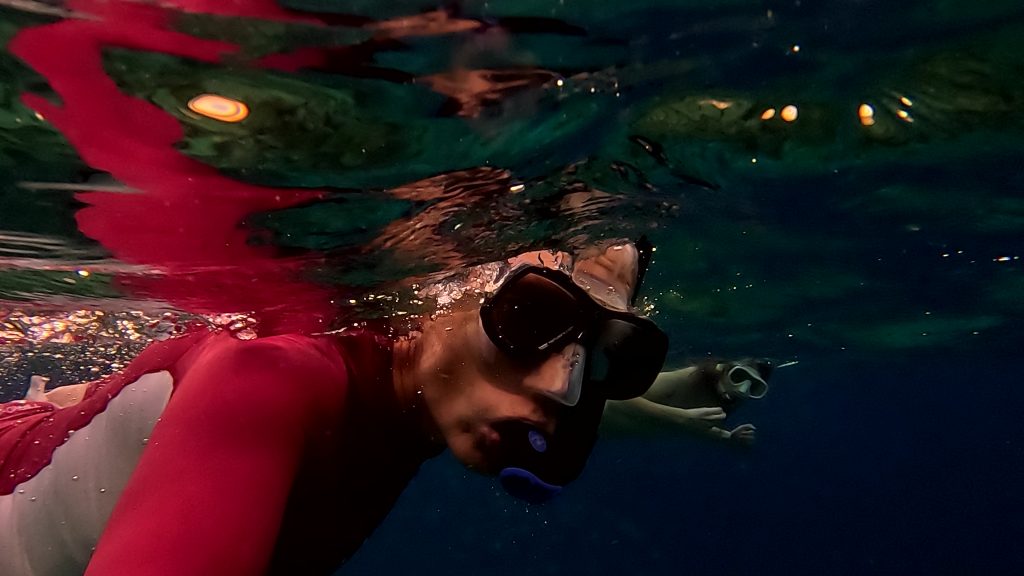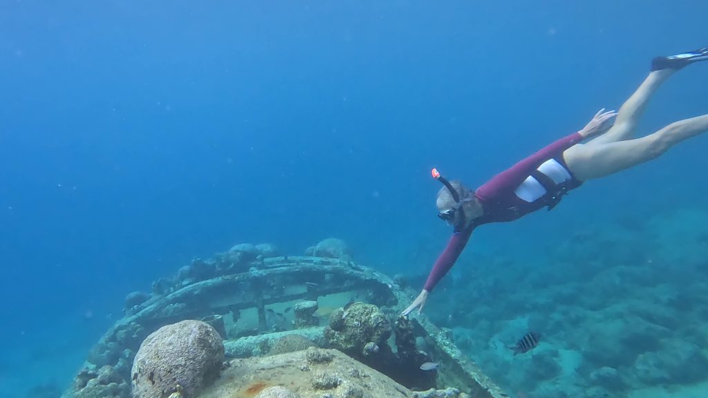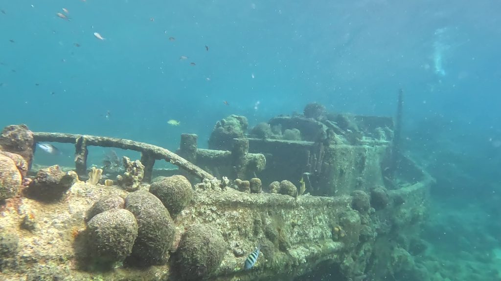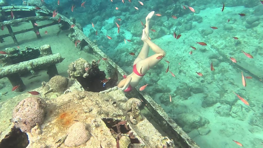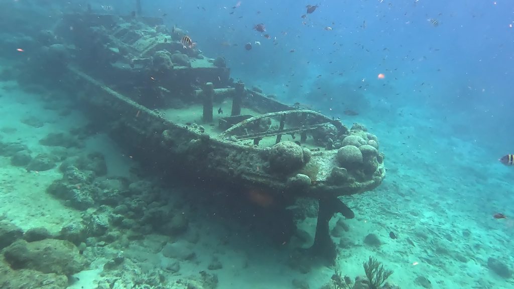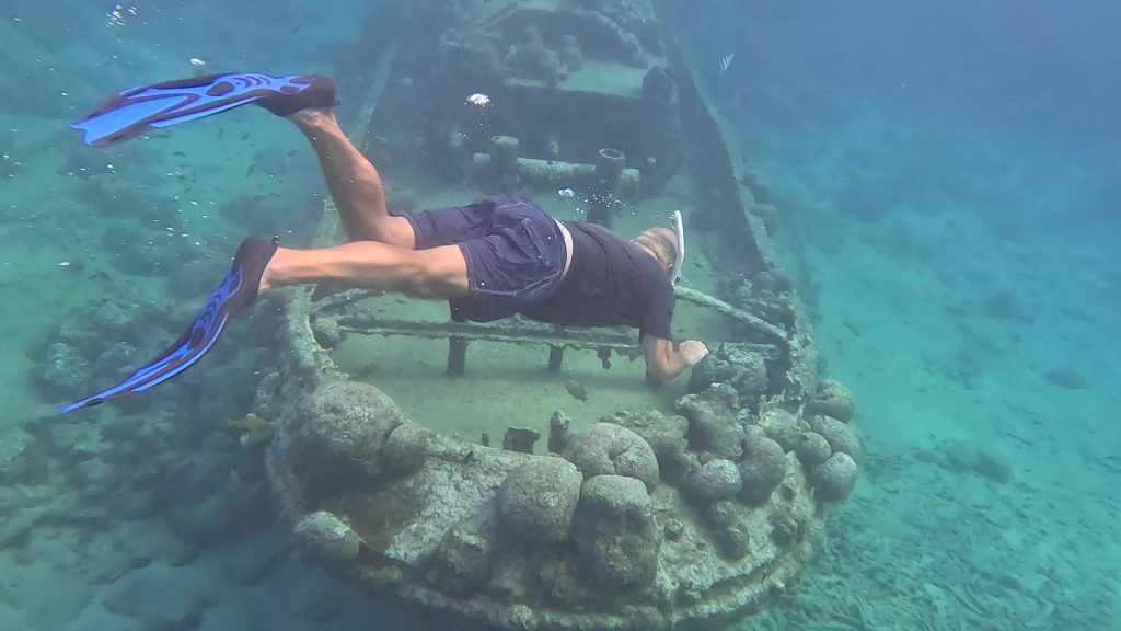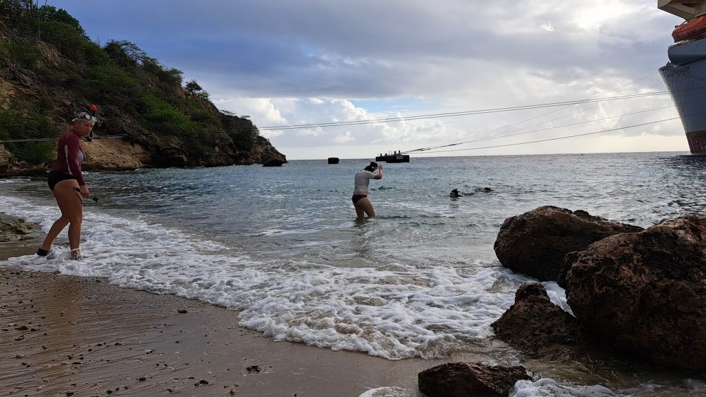 Wenn man sich dem Tug Boat Beach nähert, ist man zunächst ziemlich irritiert, vor allem, wenn dort ein Schiff wie die Noble Voyager liegt. Hier soll man tauchen und schnorcheln können? Wie so oft: Unerschrocken sein und sich einlassen. Man ist ziemlich schnell begeistert über einen unerwarteten Ort in unerwarteter Umgebung.