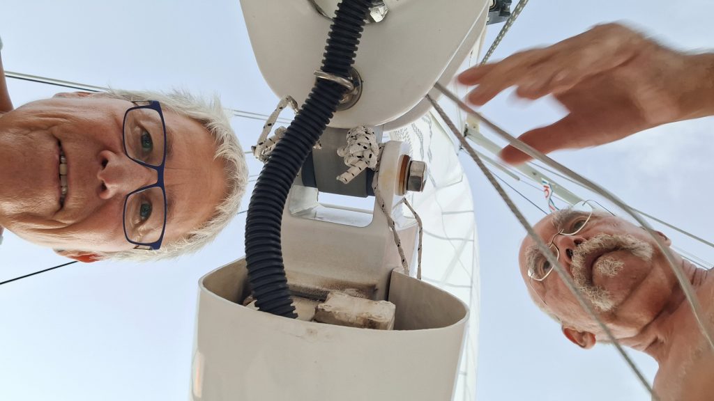 Und wo wir schon bei Bootsarbeiten waren, haben wir den Hals des neuen Großsegels noch einmal neu gelascht. Anke war mit der Qualität meiner Erstlasching nicht zufrieden. Eine fummelige Angelegenheit und dazu diesmal noch unter Ankes kritischen Augen!