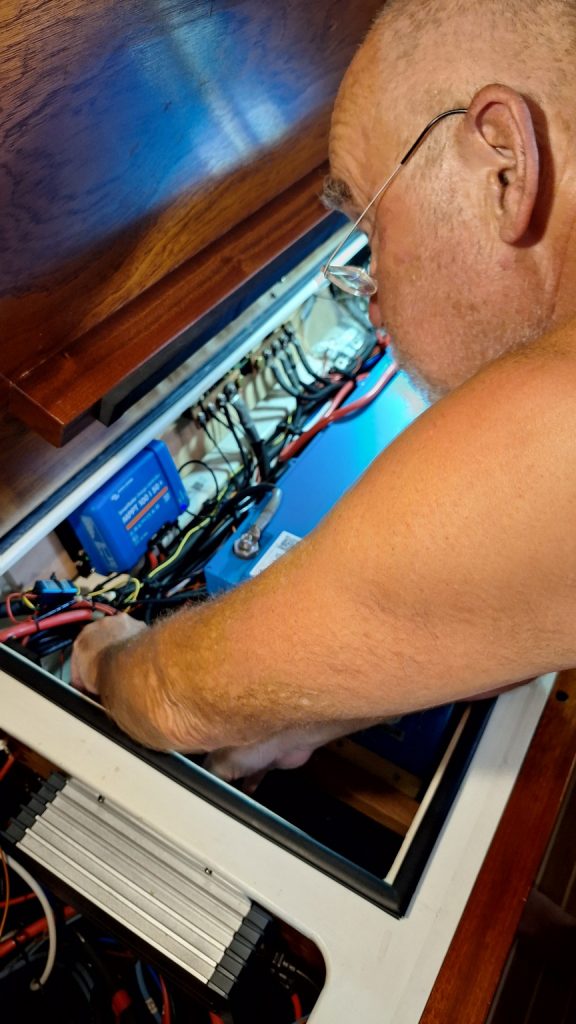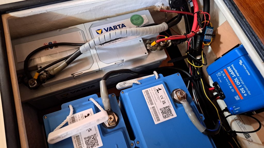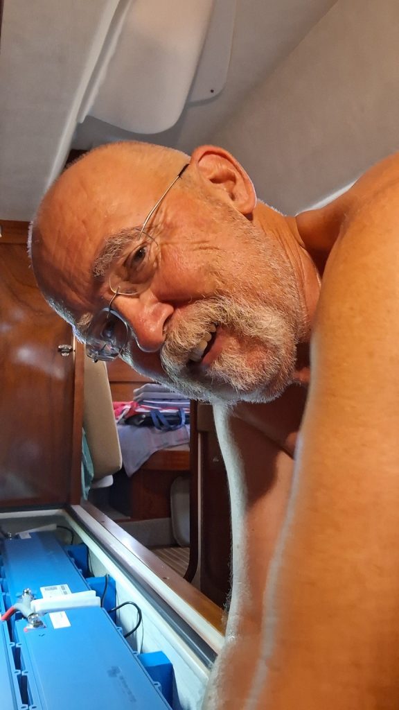 Martin klemmt die alte Starterbatterie ab. Durch die Hilfe anderer Segler und der WhatsApp-Gruppe „Spanish Waters“ waren wir über die örtlichen Möglichkeiten schnell informiert. Im Fachgeschäft „Battery Solutions“ bekamen wir problemlos, was wir wollten. Eine 110 Ah-Starterbatterie, sogar von Varta und fast mit den gleichen Maßen wie das alte Modell.