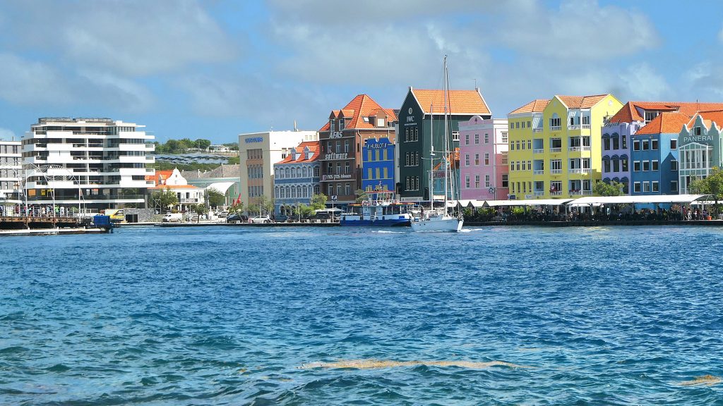 Mago del Sur hat die schwimmende Emma-Brücke von Willemstad passiert – man kann sie im Bild links noch ahnen, und strebt der offenen See zu. (Foto: Jürgen und Gaby Eichelmann) Die Brücke ist ein technisches Kleinod und gibt es in dieser Form nur einmal. Bei Interesse einfach mal danach googeln.