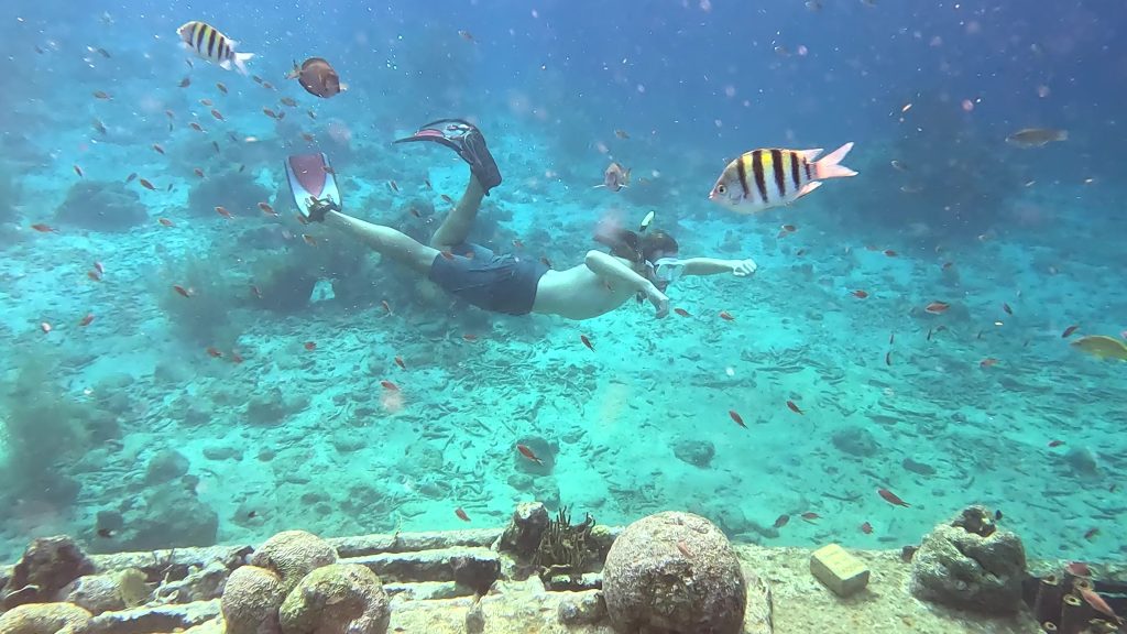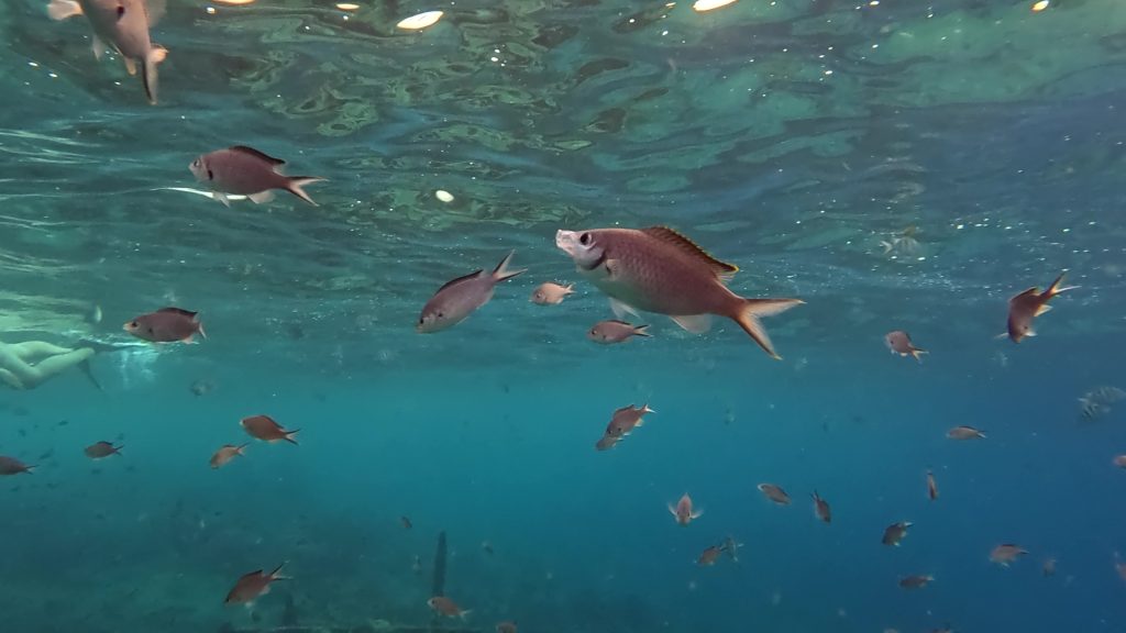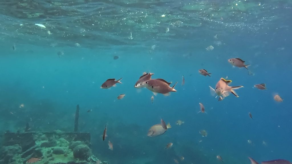 Die superfreundliche Chefin des Tug Boat Beach hatte uns eine Unterwasserroutenempfehlung gegeben. Tim, Helena und Anke machen die Runde natürlich andersrum, aber das ist ja egal. Erste Entdeckung: neugierige Fischlein. Es dürfte sich um Braune Chromis (Chromis multilineata) handeln.