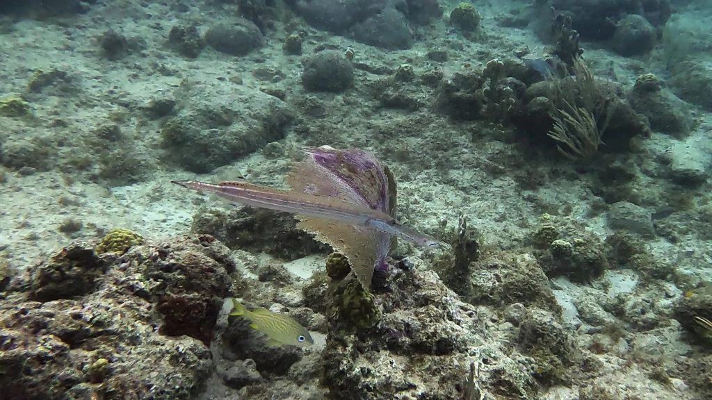 Erste Impressionen: Atlantik-Trompetenfisch (Aulostomus maculatus) vor einer Fächerkoralle in Begleitung eines Franzosen-Grunzers (Haemulon flavolineatum).