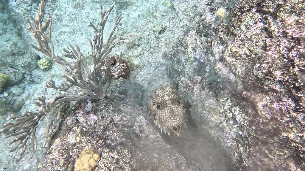 Man muss genau hinschauen. Dann erkennt man den gut getarnten Fisch. Leider ist es uns nicht gelungen, ihn sicher zu bestimmen. Zu einem Kofferfisch passt nicht, dass er Stacheln hat. Wir vermuten daher einen Igelfisch, zumal er sich bei Ankes Annäherung etwas „aufgeblasen“ hat.