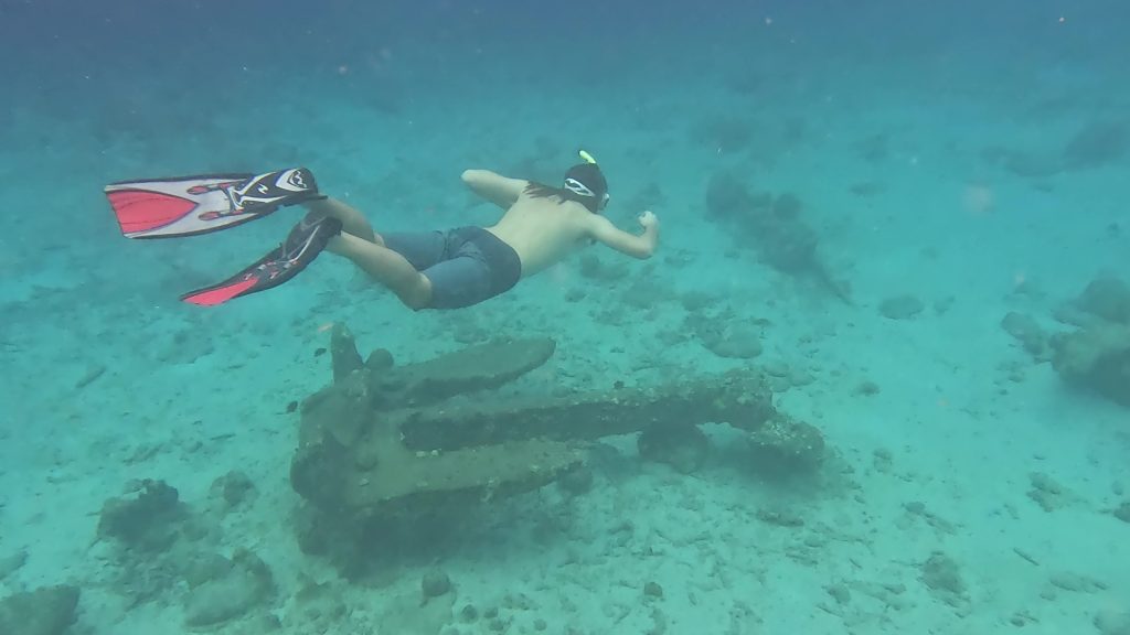 Am Ende der Schnorchelrunde besichtigen die drei Punkt Nummer zwei in der Liste der Chefin, einen verlorenen Anker.