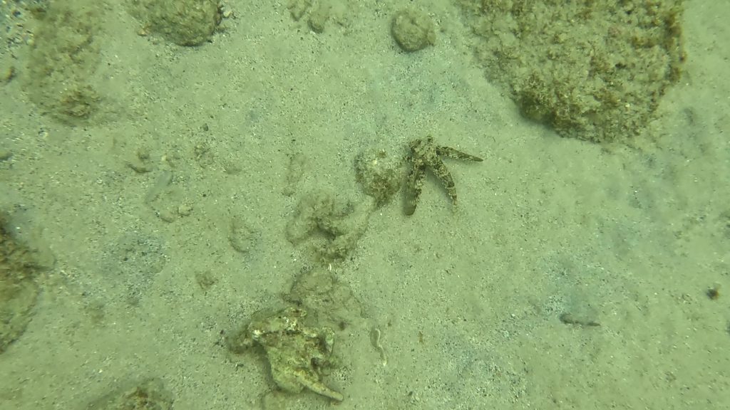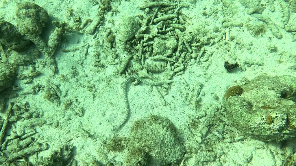 Auf dem Rückweg entdecken wir einen Spitzschwanz-Schlangenaal (Myrichthys breviceps). Er fiel uns zwischen den Strukturen am Grund zuerst durch seine Bewegung auf. Die Tarnung ist an sich perfekt.