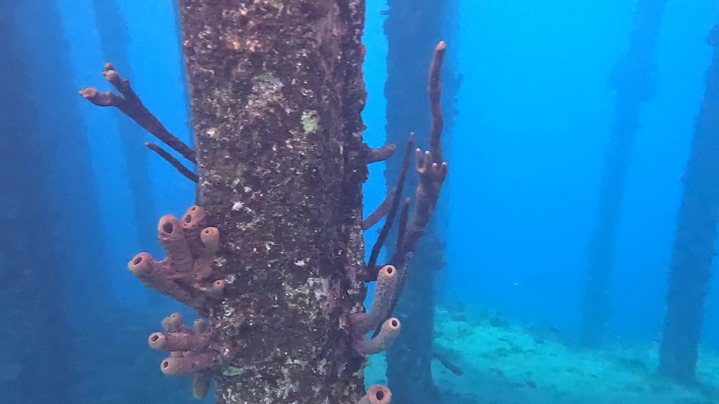 Zunächst geht es zu verbotenem Terrain: Unter die Stützkonstruktion des Piers, an dem der Noble Voyager lag. Er ist an dem Tag, an dem wir nach Spanish Waters verlegten, aufgebrochen. Die Hurricane-Saison ist durch, jetzt kann der Meersgrund wieder erkundet werden. An den Stahlröhren, die die Pier gründen, haben sich unter anderem Ofenrohr-Schwämme (Aplysina archeri) angesiedelt.
