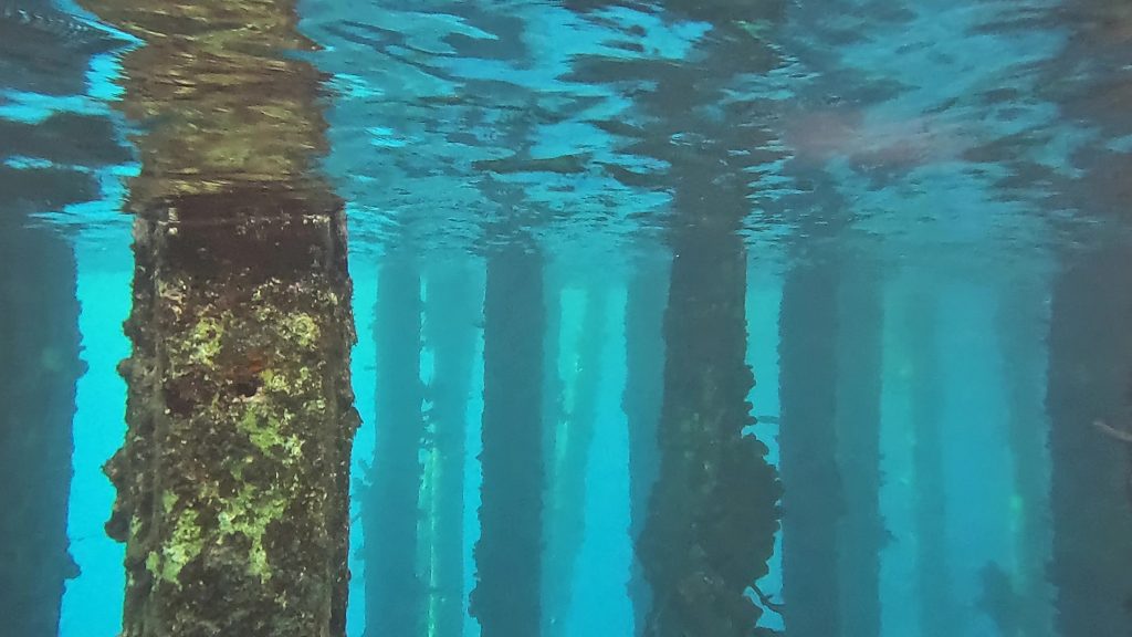 Die Unterkonstruktion der Pier bildet ein spannendes Licht- und Schattenbiotop. Unwillkürlich muss ich an die fotografischen Arbeiten und Kunstwerke von Bree Corn denken. Sie könnte hier doch auch mal eine Unterwasserarbeit kreiieren. Mit spannenden Körpern und nasser Garderobe.
