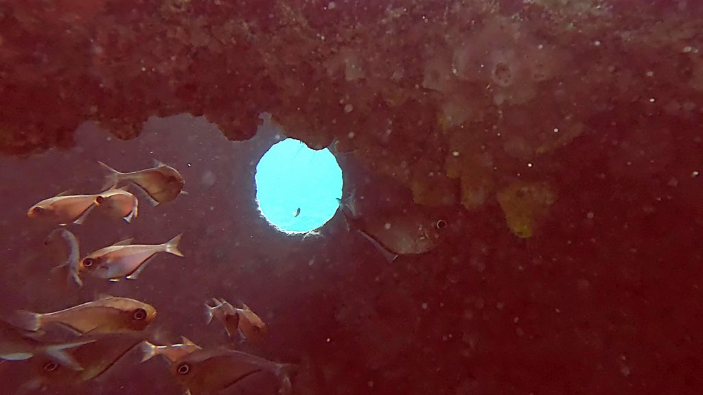 Blick ins Innere des Tug Boat. Hier hält sich ein Schwarm Kupfer-Beilbauchfische (Pempheris schomburgki) auf.
