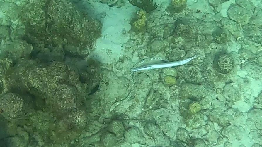 Nicht ganz scharf, aber es geht um die Sache. Der Schlangenaal wurde plötzlich von einem Trompetenfisch begleitet, der nicht von ihm losließ und sich gelegentlich regelrecht auf den Aal drauf legte. Ob der Trompetenfisch einfach nur was vom Jagderfolg des Aals abbekommen wollte, oder sich in ihn verliebt hatte, wer weiß das schon? Der kleine dunkle Fisch links davon – kaum wahrzunehmen – war vom Trompetenfisch nicht begeistert und versuchte wiederholt furchtlos diesen wegzubeißen.