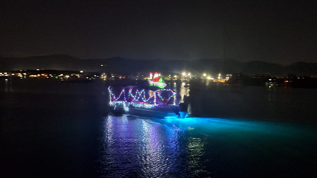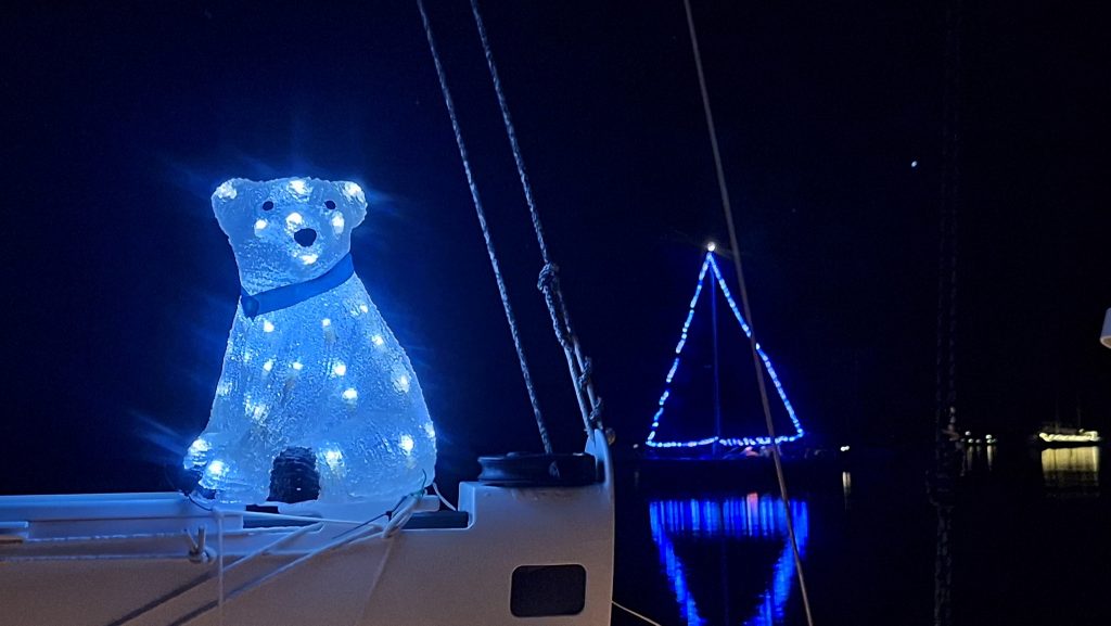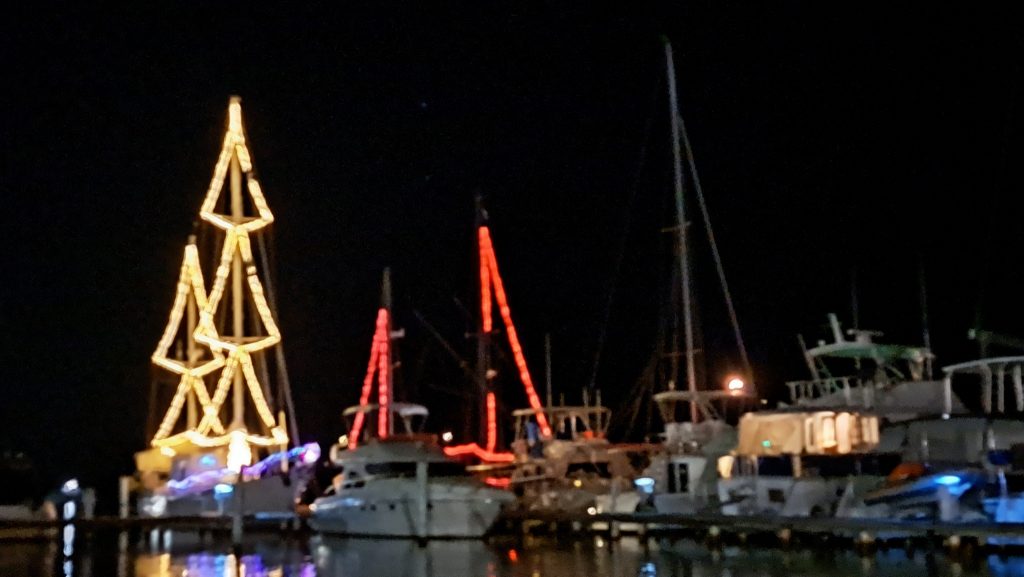 Schärfemäßig war vom schwankenden Dingi aus nichts zu machen – Weihnachtsstimmung mit Hilfe der Boote an den Stegen des Yachtclubs von Salinas.