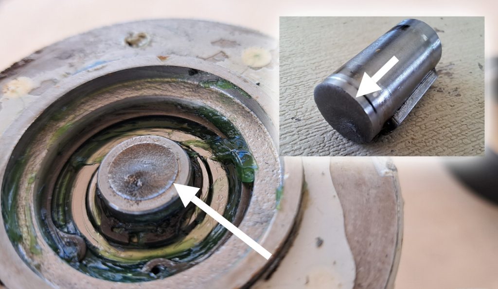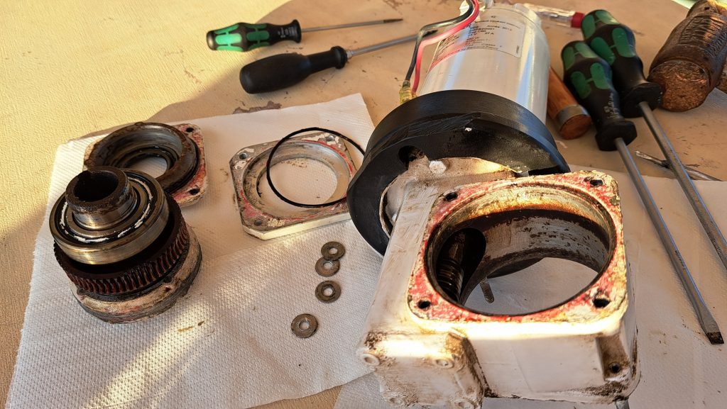 Und dann waren Motor und Umlenkgetriebe voneinander zu lösen. Anke hat beides noch als Einheit verbunden in der Hand. Erst danach konnten wir feststellen, was das voranstehende Foto bereits verdeutlicht. Der Bildhintergrund lässt trotz allem ahnen, wir betreiben Wassersport 😊.