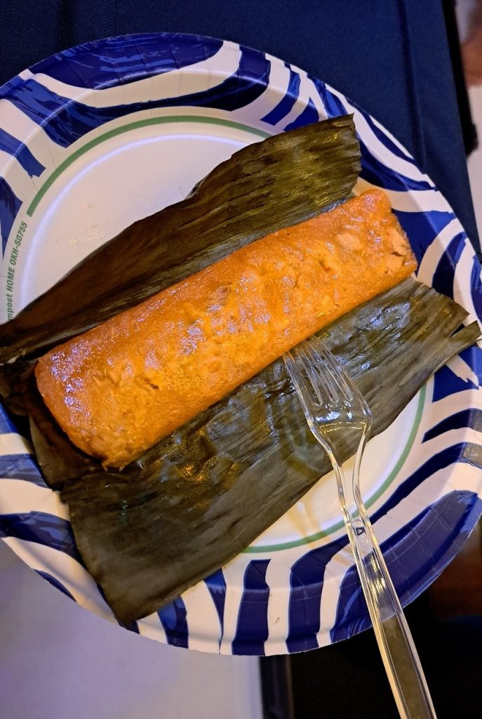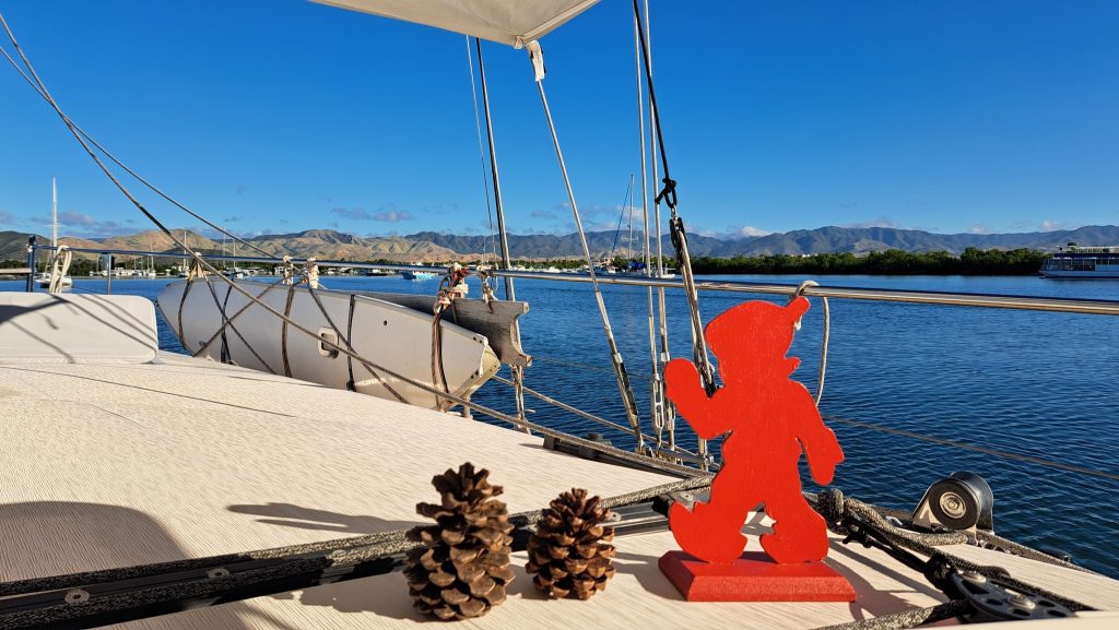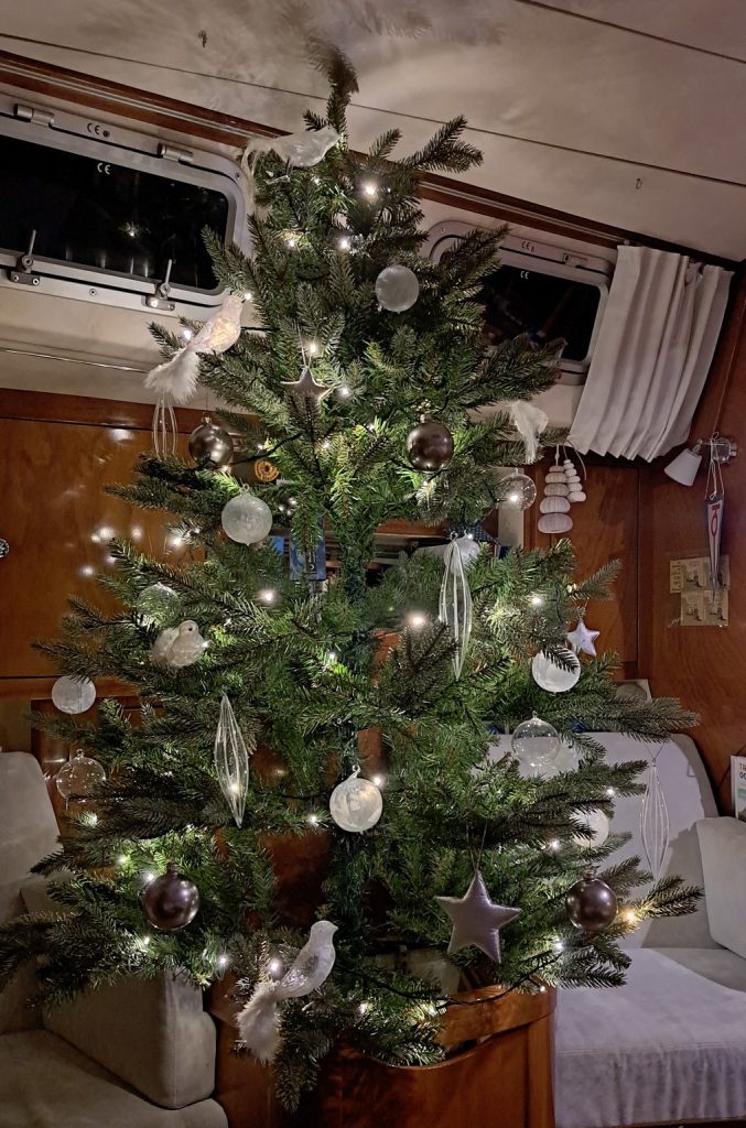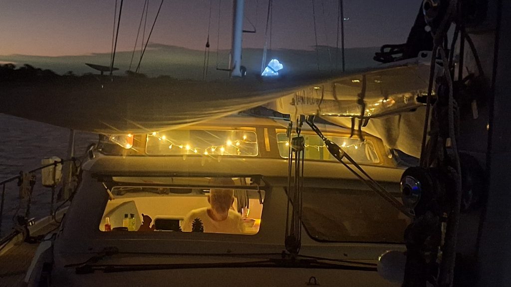 Willie hatte ja nur von einem kleinen Umtrunk gemurmelt. Es gab dann aber diese Pastel-Dinger im Bananenblatt, Shrimps mit Sauce, irgendwelche Fleischstückchen und und und. Und außerdem endete der Umtrunk nicht mit Sonnenuntergang, sondern setzte sich auf unbestimmte Zeit fort, da waren wir längst zurück an Bord und in den Kojen. Der eine oder andere hatte dagegen am Morgen des Ersten Weihnachtstages Probleme, dieselbe zu wieder verlassen. 😉 Heilig Abend bei uns an Bord fand letztlich nicht statt und wurde vertagt, obwohl ich doch tagsüber noch den in der Bilge ruhenden Weihnachtsbaum aufgebaut und geschmückt hatte.