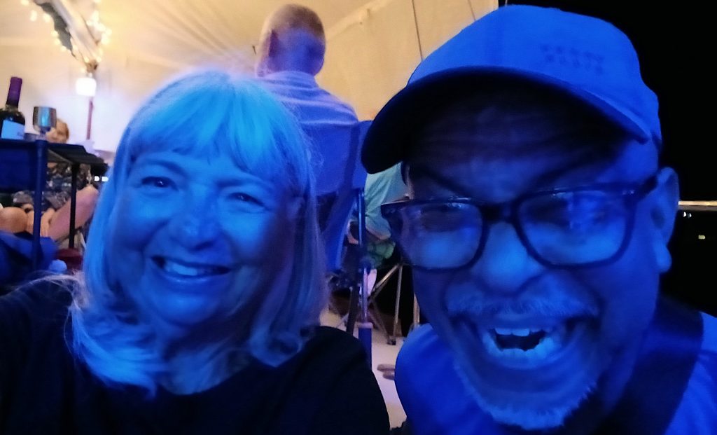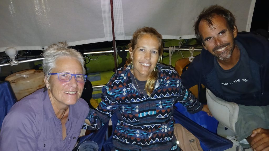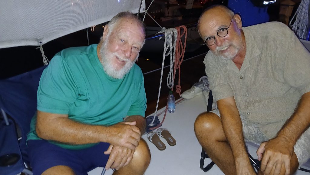 Willi (links) und ihr Gatte – der hatte sich irgendwo verdrückt – von der Liahona hatten die gesamte (!!!) Seglergemeinschaft zu einem Heilig Abend-Umtrunk eingeladen. Rechts ein buchtbekannter Spaßvogel, der sich auch gleich dazu gesellt hat.