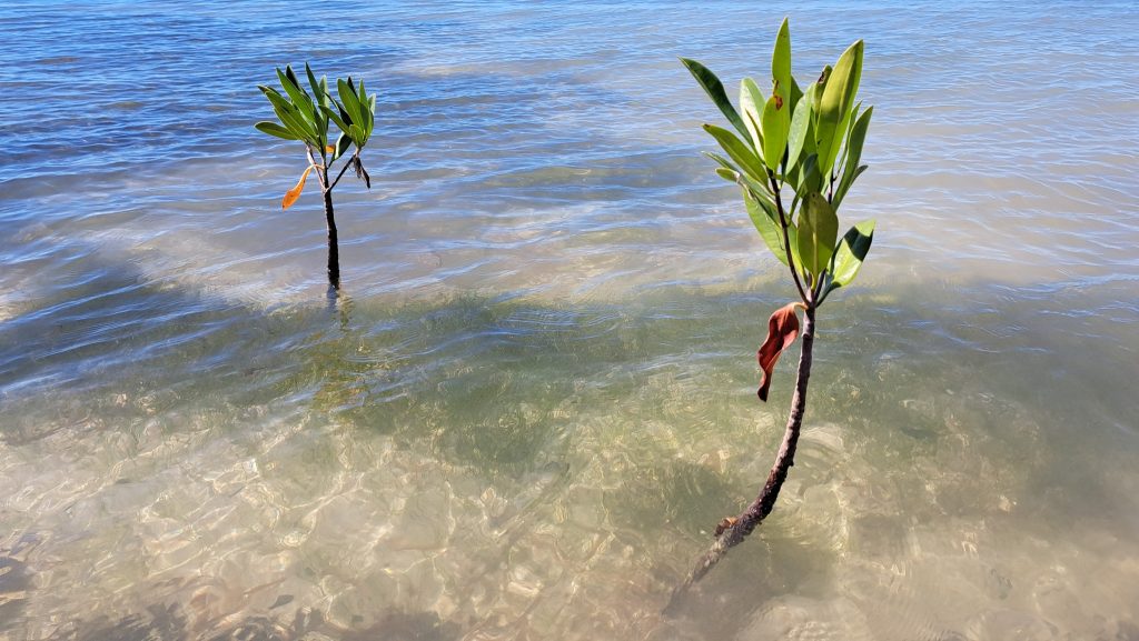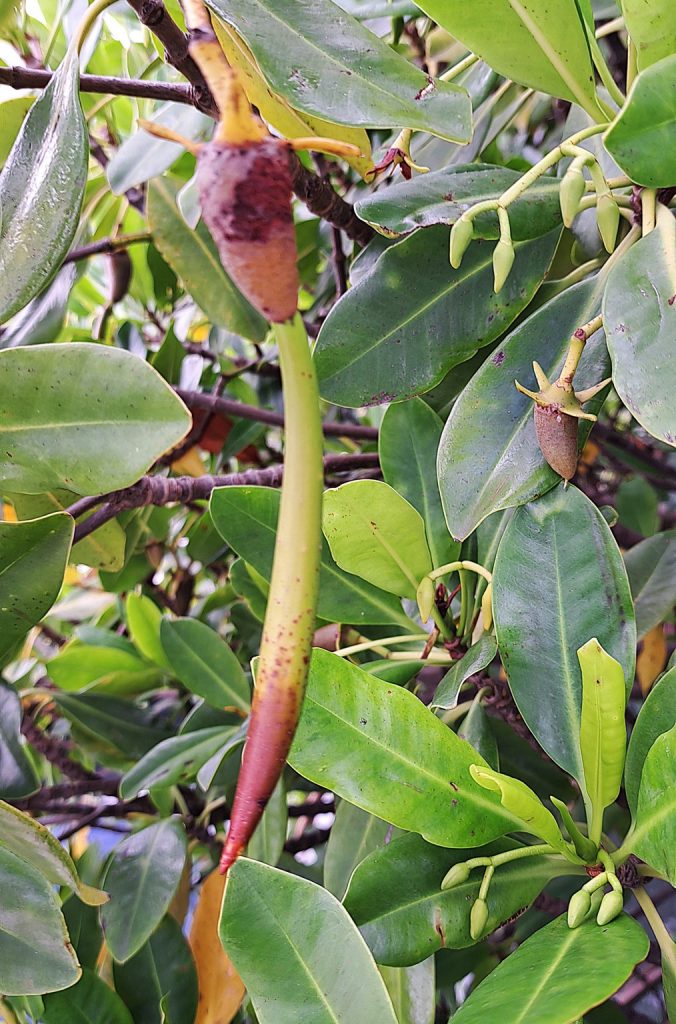Ein Mangrovenkeimling hat im Tidenspülsaum Fuß gefasst, besser Wurzel gefasst und beginnt zu treiben.