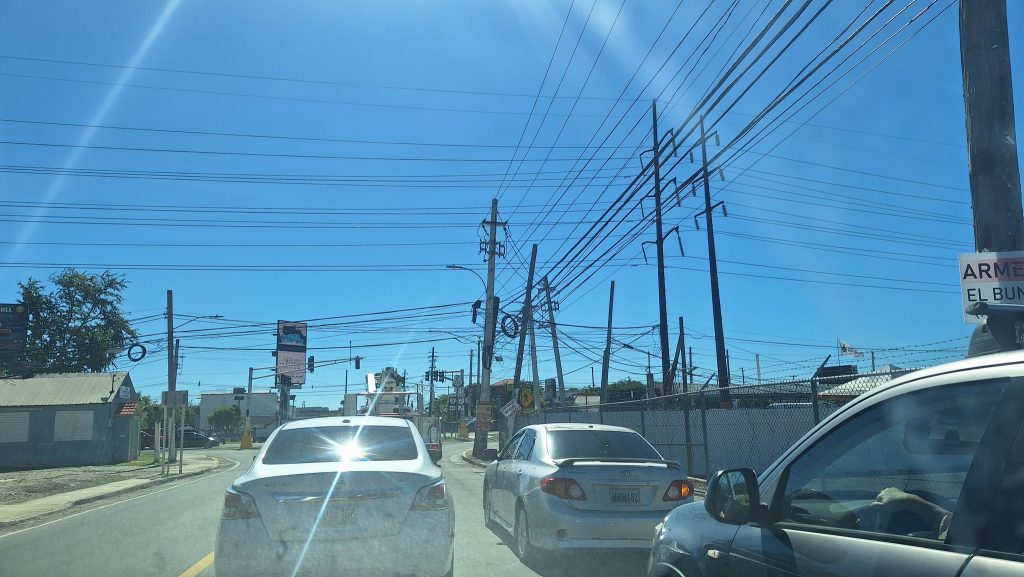 Fast schon Großstadt-Verkehr. Es geht quer durch Ponce. Irgendwie ist´s schon amerikanisch hier. So hängt der Himmel nicht voller Geigen, sondern voller Kabel.
