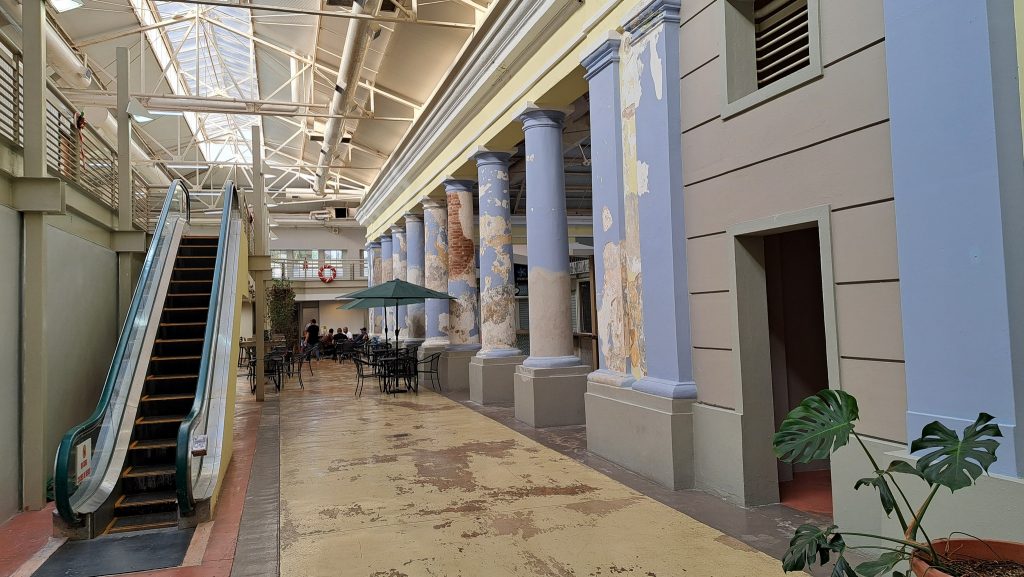 Einer der vier identisch wirkenden Eingänge des Mercado Reina Isabel Segunda. Der Markt geht auf die Mitte des 19. Jahrhunderts zurück und war seinerzeit nach Pariser Vorbildern entstanden. Bei einer Erweiterung im Jahre 1941 erhielt er die heutige Art Deco-Fassade. Schöpfer dieser Erweiterung war der in Ponce geborene Architekt mit dem sinnigen Namen Pedro Mendez Mercado.