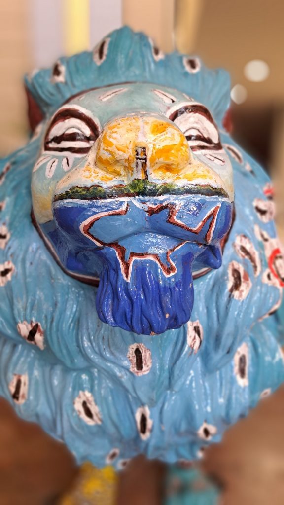 Man muss genau hinschauen, Der Löwe zeigt nicht nur einen deutlich erkennbaren Fisch im Wasser, sondern auch die Kontur einer flachen Insel und einen Turm. Möglicherweise ein Leuchtturm. Einer der Löwen in der Markthalle.