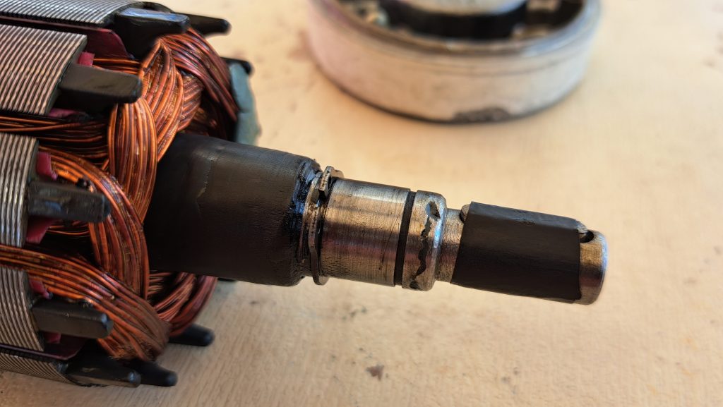 Der Rotor, die kraftspendende Seele des Elektromotors ist heraus. Voraussetzung war die Trennung von Getriebe und E-Motor, was uns ohne Zugang zu Ronnies Werkstatt kaum gelungen wäre. Wie sich dann zeigte, war auch das im unteren Bild liegende Ende zu entfernen. Auch dies erforderte Ronnies Werkstatt und einen seiner Dreiarm-Abzieher. Letztlich gelang uns, alles zu zerlegen, was zu zerlegen war. Und das ohne irgendwelche Kolateralschäden.