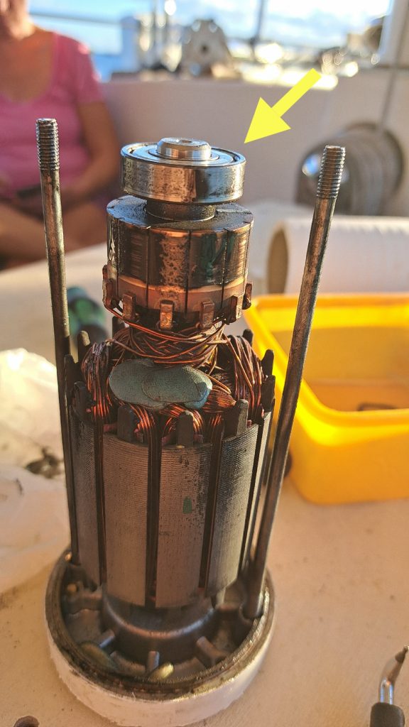 Unser Missgeschick von der Überfahrt verdeutlicht sich hier. Der Schaft des Antriebmotors für den sogenannten Linetender, der das Schothorn des Großsegels kontrolliert, ist exakt dort, wo er von 15 auf 11 mm reduziert wird, schlicht abgeschert. Das große Foto zeigt den Schaft am Motor, das kleine die abgescherte Fortsezung.