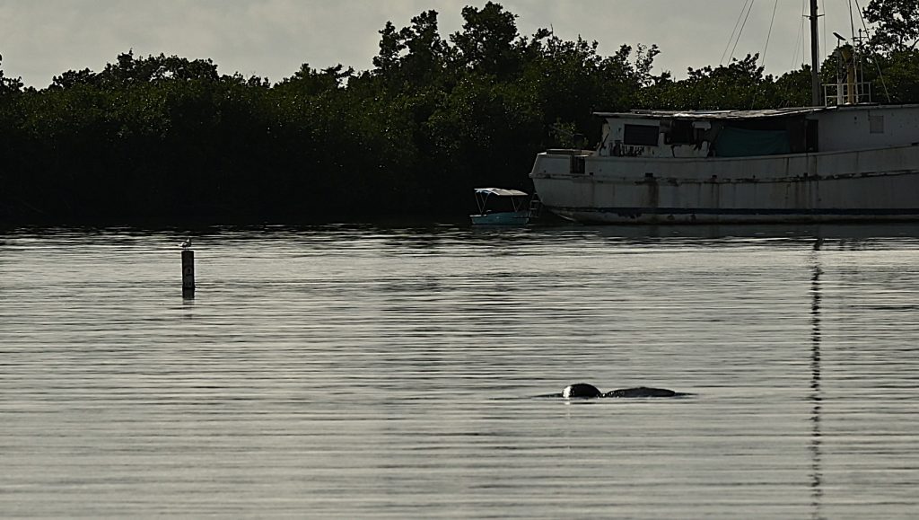 Viel ist nicht zu sehen, doch immerhin ist dies eines der wenigen Beweisfotoos, dass wir hier Manatis gesehen haben, präziser gesagt Karabik-Manatis (Trichechus manatus).