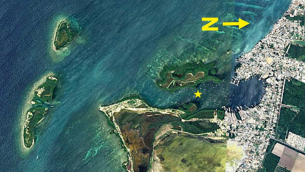 Die absolut ruhige Bucht von Salinas. Unser Ankerplatz zwischen mangrovengesäumten Ufern ist mit einem Sternchen markiert. (Bildquelle: Google Earth, bitte beachten, Norden ist rechts, nicht oben)