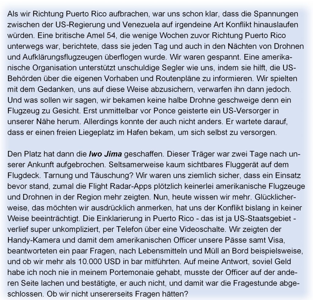 Wir hatten unseren Ankerplatz in Ponce verlassen und die seltsame „Sarginsel“ aufgesucht. Und von dort ging es weiter in die hervorragend geschützte Bucht von Salinas. Salinas ist als Ort nicht gerade der Knaller, aber er bietet zwei Supermärkte, einen sogar mit Lieferservice, ein paar Restaurants und mit Ronnie Ramos eine super hilfsbereite Seele. Ronnie ist ein puertoricanischer Blauwassersegler, den wir noch in Curaçao flüchtig kennengelernt hatten. Er unterstützte uns in den nächsten Tagen mit Rat und Tat. Und er unterstützt auch sonst jeden Segler, der Hilfe welcher Art auch immer benötigt.