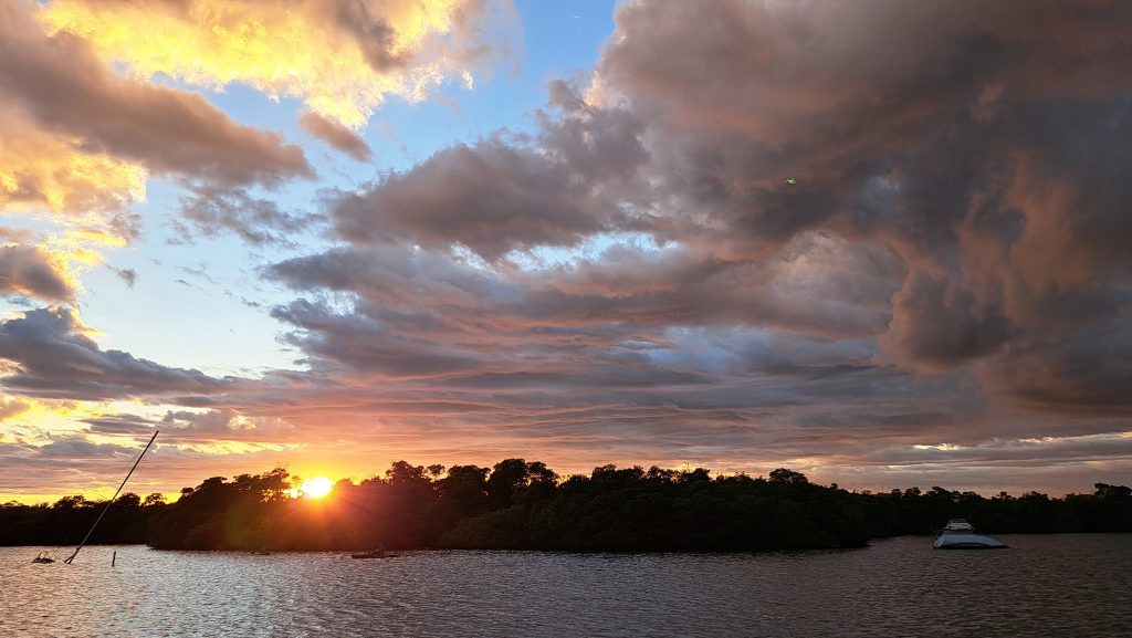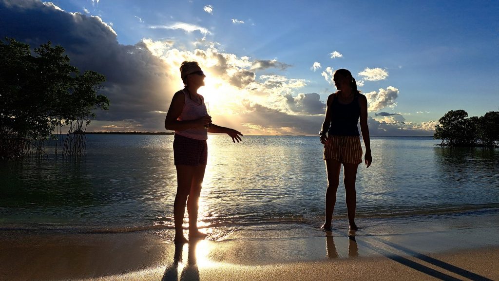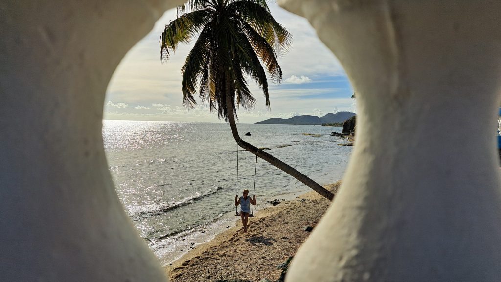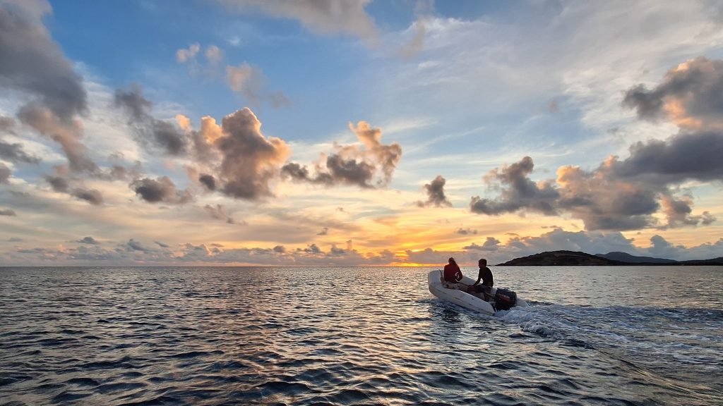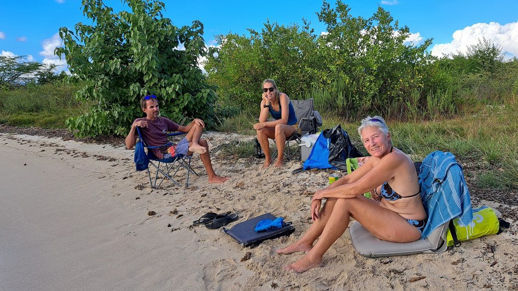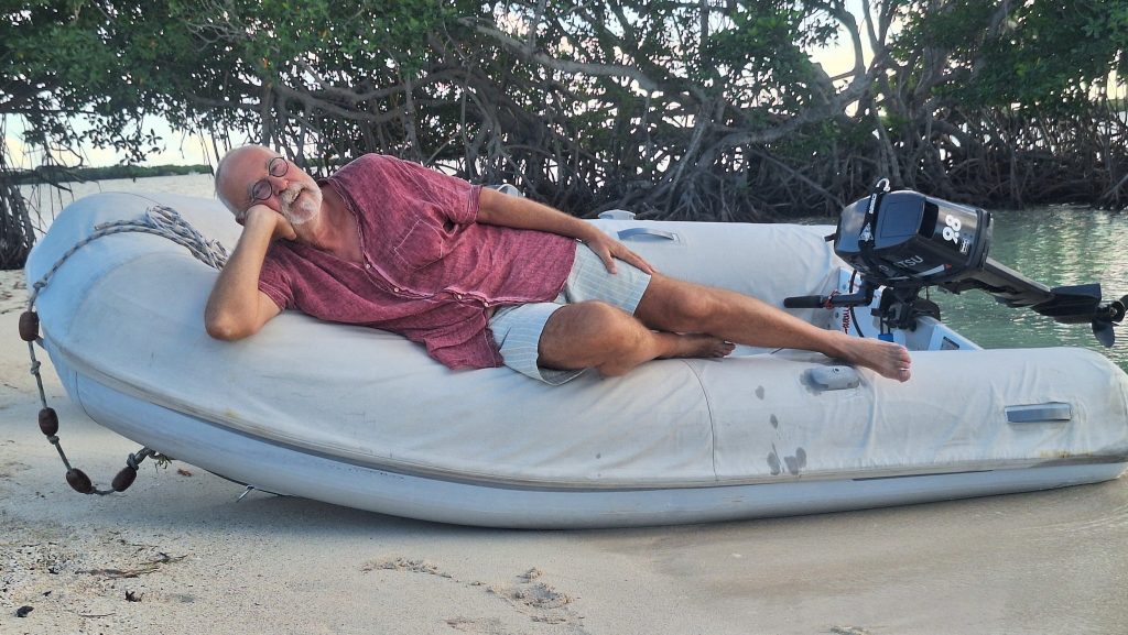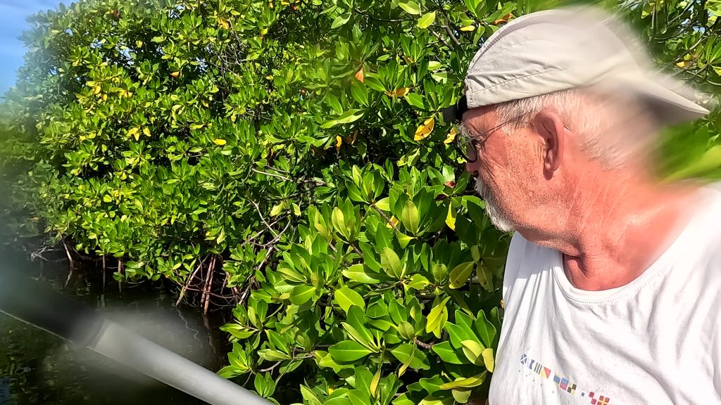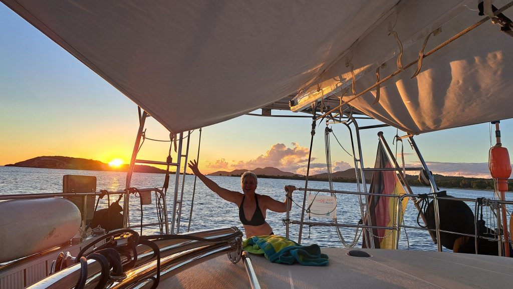 Vorteil der Siesta: Es gibt kein Gedränge an der Schaukel.Intermezzo – Wie war das mit Boot reparieren an den schönsten Orten der Welt? Ausnahmsweise ist es diesmal kein Bootsdefekt, sondern der schlichte Wasserkocher will das Wasser nicht mehr kochen. Bestenfalls halbgaren. Martin versucht, das steuernde Bimetall zu finden bzw. den Kocher kurzerhand kurzuschließen.Auf geht´s zur Mosquito Bay. Arjen und Lisa düsen voraus. Sie brauchen Speed, um das eingedrungene Wasser aus dem Dingi zu saugen. (Seit wir die beiden kennen, kämpfen sie mit ihrem beständig leckenden Dingi. Stets wohlgemut, denn sie bekamen es geschenkt.)Die Mosquito Bay ist nach wildem Ritt gegen Wind und Welle erreicht. Im Eingangskanal haben wir die Motoren ausgestellt und paddeln nun vorsichtig hinein. Zur Freude der ausgehungerten Namensgeber.Es war nix zu machen. Die durchaus kräftigen und außergewöhnlich konzentrierten Leuchterscheinungen ließen sich nicht auf den Sensoren festhalten. Keine Chance.Deshalb schummeln wir hier ein wenig. (Also, Martin ist es, der hier schummelt.) Mit Hilfe des Fotos eines Freundes, das wir auf dessen Homepage gefunden haben. Aus den gleichen Gründen hat er es jedoch auch nicht selber gemacht, sondern ebenfalls auf einen Freund zurückgegriffen. Nun, ich glaube, der Freund war ein Internetauftritt eines Anbieters für Touren auf eben dieser Bucht. 😉 Und dort werden die Leuchterscheinungen in bläulichem Licht gezeigt. Blau ist durchaus möglich. Nach Auskunft einer heimischen Expertin, mit der wir ins Gespräch kamen, allerdings nur im Hochsommer bei besonders warmen Bedingungen. Ich habe hier versucht, halbwegs den Farbton zu treffen, den wir erlebt haben. Davon sind diese Bilder jedoch noch weit entfernt. Der reale Ton war eher blassblaugrün.Man musste nur im Wasser wedeln, um ein leuchtendes Feuerwerk auszluösen. Unsere Expertin erklärte uns, dass bei günstigen Bedingungen auch Strömungsscherungen innerhalb der Mosquito Bay zu leuchten beginnen. Und wir sahen neben unserem Dinghy die Konturen eines kleinen Haies durch das nachtschwarze Wasser aufflammen. „Faszinierend“, um nach langer Zeit mal wieder Spock zu zitieren, nicht immer nur Brigitte.Zwei, drei Tage später. wir liegen in der Ensenada Honda von Vieques, nicht zu verwechseln mit der gleichnamigen Bucht auf Culebra, und machen uns gemeinsam mit Lisa und Arjen auf, einen kleinen Wasserarm in den Mangroven zu erkunden. Ab einem bestimmten Punkt wird nur noch gerudert bzw. gepaddelt, denn wir wollen die hier möglicherweise anzutreffenden Baby-Schildkröten nicht stören. Die spannenden Effekte des Fotos erzielt man übrigens, indem man (Martin) sein Handy (ungewollt) ins Wasser taucht. Links und rechts begleiten uns Mangroven. Genau beobachtet begleitet uns ein etwas höher gewachsener Streifen, dann folgen niedrigere Mangroven und, wie wir vermuten, dazwischen stellenweise offene Wasserflächen. Hier und da können wir zumindest offenes Wasser durch das Geäst spiegeln und blitzen sehen. Vor einem Jahrzehnt waren die Mangrovenbestände wahrscheinlich erhebllich höher, doch Hurricane Maria hat hier wie an vielen anderen Orten, wahrscheinlich alles abrasiert.So sieht es aus, wenn man unterhalb des Paddels ins Wasser schaut. Außer Luftblasen weder Fisch noch Schildkröt.Das ist, was wir suchen: Upside Down Jellyfish – Mangroven-Quallen (Cassiopea xamachana). Es handelt sich um eine Quallenart, die nur selten im freien Wasser herumtreibt, sondern sich auf dem Grund, häufig auch in Seegrasbetten anheftet und dabei ihre „Bauchseite“ nach oben dreht. Zwischen ihren Tentakeln leben Algen, die Photosynthese betreiben und mit der Qualle in symbiotischer Gemeinschaft leben. Alle blassbraungelblichen Gebilde auf dem Foto sind Mangroven-Quallen, bei den beiden ganz rechts kann man ihre wahre Wesenheit anhand des deutlich sichtbaren Schirms besser erkennen.In der Vergrößerung zerbröselt das Foto etwas, doch dass wir es mit einer Quallenart zu tun haben , wird deutlich.Wir paddeln zurück …Anke freut sich nach einem erfrischenden Sonnenuntergangsbad …