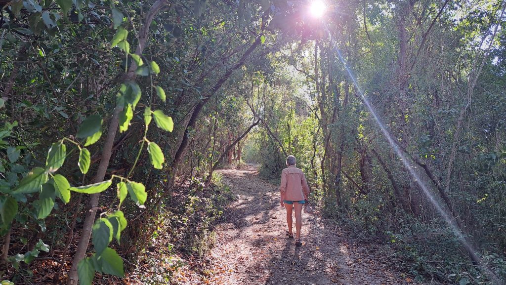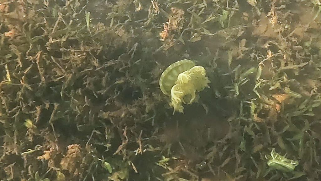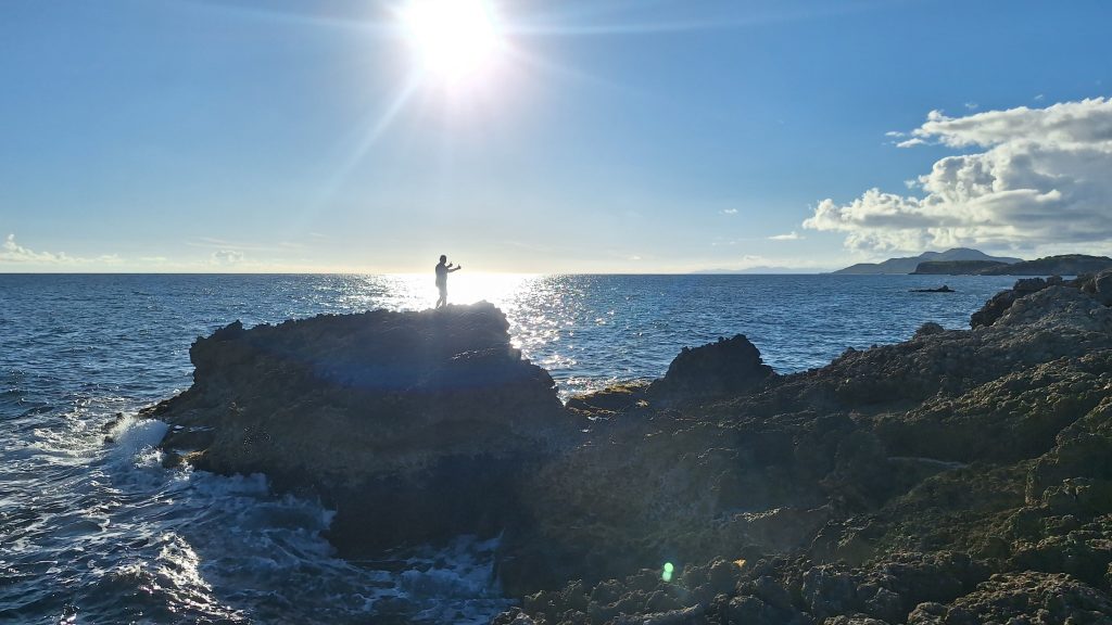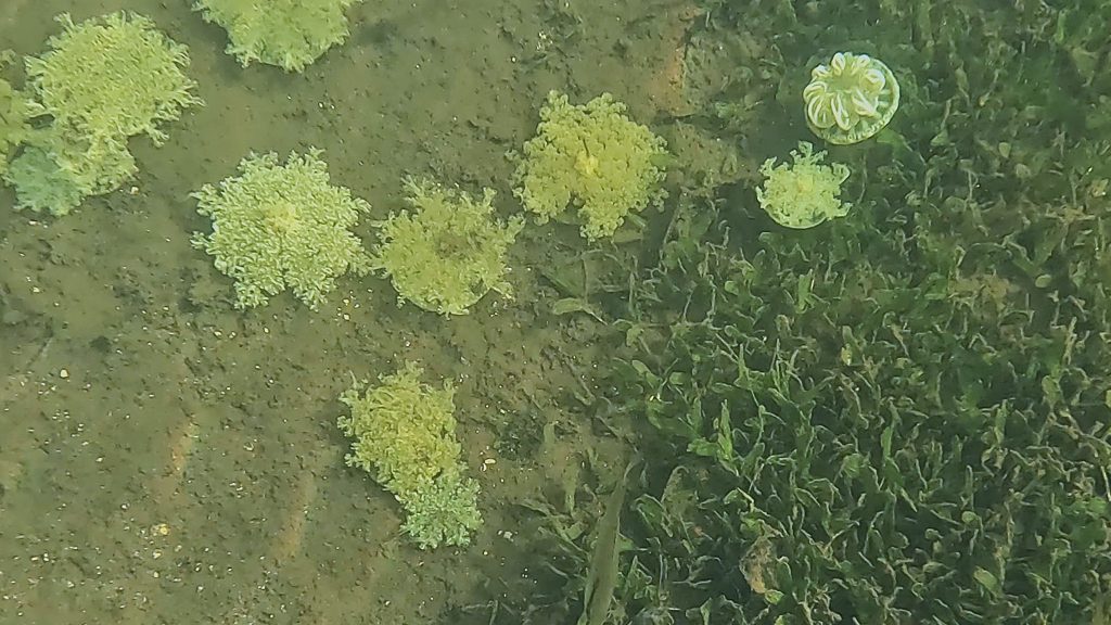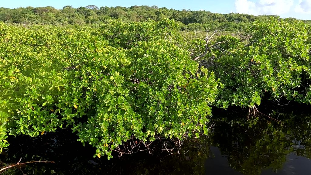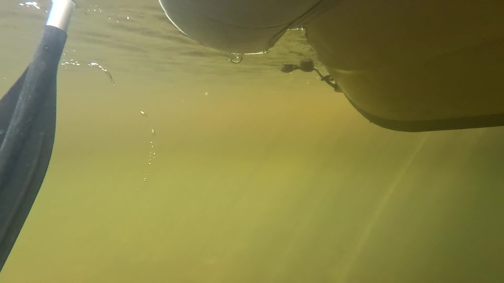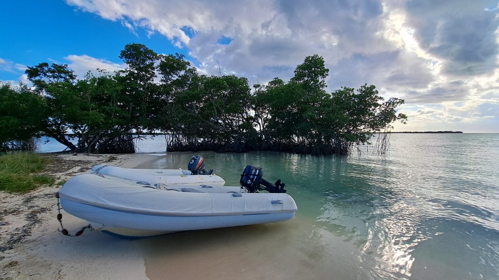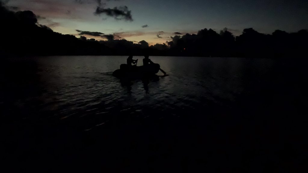 Vorteil der Siesta: Es gibt kein Gedränge an der Schaukel.Intermezzo – Wie war das mit Boot reparieren an den schönsten Orten der Welt? Ausnahmsweise ist es diesmal kein Bootsdefekt, sondern der schlichte Wasserkocher will das Wasser nicht mehr kochen. Bestenfalls halbgaren. Martin versucht, das steuernde Bimetall zu finden bzw. den Kocher kurzerhand kurzuschließen.Auf geht´s zur Mosquito Bay. Arjen und Lisa düsen voraus. Sie brauchen Speed, um das eingedrungene Wasser aus dem Dingi zu saugen. (Seit wir die beiden kennen, kämpfen sie mit ihrem beständig leckenden Dingi. Stets wohlgemut, denn sie bekamen es geschenkt.)Die Mosquito Bay ist nach wildem Ritt gegen Wind und Welle erreicht. Im Eingangskanal haben wir die Motoren ausgestellt und paddeln nun vorsichtig hinein. Zur Freude der ausgehungerten Namensgeber.Es war nix zu machen. Die durchaus kräftigen und außergewöhnlich konzentrierten Leuchterscheinungen ließen sich nicht auf den Sensoren festhalten. Keine Chance.Deshalb schummeln wir hier ein wenig. (Also, Martin ist es, der hier schummelt.) Mit Hilfe des Fotos eines Freundes, das wir auf dessen Homepage gefunden haben. Aus den gleichen Gründen hat er es jedoch auch nicht selber gemacht, sondern ebenfalls auf einen Freund zurückgegriffen. Nun, ich glaube, der Freund war ein Internetauftritt eines Anbieters für Touren auf eben dieser Bucht. 😉 Und dort werden die Leuchterscheinungen in bläulichem Licht gezeigt. Blau ist durchaus möglich. Nach Auskunft einer heimischen Expertin, mit der wir ins Gespräch kamen, allerdings nur im Hochsommer bei besonders warmen Bedingungen. Ich habe hier versucht, halbwegs den Farbton zu treffen, den wir erlebt haben. Davon sind diese Bilder jedoch noch weit entfernt. Der reale Ton war eher blassblaugrün.Man musste nur im Wasser wedeln, um ein leuchtendes Feuerwerk auszluösen. Unsere Expertin erklärte uns, dass bei günstigen Bedingungen auch Strömungsscherungen innerhalb der Mosquito Bay zu leuchten beginnen. Und wir sahen neben unserem Dinghy die Konturen eines kleinen Haies durch das nachtschwarze Wasser aufflammen. „Faszinierend“, um nach langer Zeit mal wieder Spock zu zitieren, nicht immer nur Brigitte.Zwei, drei Tage später. wir liegen in der Ensenada Honda von Vieques, nicht zu verwechseln mit der gleichnamigen Bucht auf Culebra, und machen uns gemeinsam mit Lisa und Arjen auf, einen kleinen Wasserarm in den Mangroven zu erkunden. Ab einem bestimmten Punkt wird nur noch gerudert bzw. gepaddelt, denn wir wollen die hier möglicherweise anzutreffenden Baby-Schildkröten nicht stören. Die spannenden Effekte des Fotos erzielt man übrigens, indem man (Martin) sein Handy (ungewollt) ins Wasser taucht. Links und rechts begleiten uns Mangroven. Genau beobachtet begleitet uns ein etwas höher gewachsener Streifen, dann folgen niedrigere Mangroven und, wie wir vermuten, dazwischen stellenweise offene Wasserflächen. Hier und da können wir zumindest offenes Wasser durch das Geäst spiegeln und blitzen sehen. Vor einem Jahrzehnt waren die Mangrovenbestände wahrscheinlich erhebllich höher, doch Hurricane Maria hat hier wie an vielen anderen Orten, wahrscheinlich alles abrasiert.So sieht es aus, wenn man unterhalb des Paddels ins Wasser schaut. Außer Luftblasen weder Fisch noch Schildkröt.Das ist, was wir suchen: Upside Down Jellyfish – Mangroven-Quallen (Cassiopea xamachana). Es handelt sich um eine Quallenart, die nur selten im freien Wasser herumtreibt, sondern sich auf dem Grund, häufig auch in Seegrasbetten anheftet und dabei ihre „Bauchseite“ nach oben dreht. Zwischen ihren Tentakeln leben Algen, die Photosynthese betreiben und mit der Qualle in symbiotischer Gemeinschaft leben. Alle blassbraungelblichen Gebilde auf dem Foto sind Mangroven-Quallen, bei den beiden ganz rechts kann man ihre wahre Wesenheit anhand des deutlich sichtbaren Schirms besser erkennen.In der Vergrößerung zerbröselt das Foto etwas, doch dass wir es mit einer Quallenart zu tun haben , wird deutlich.Wir paddeln zurück …Anke freut sich nach einem erfrischenden Sonnenuntergangsbad …
