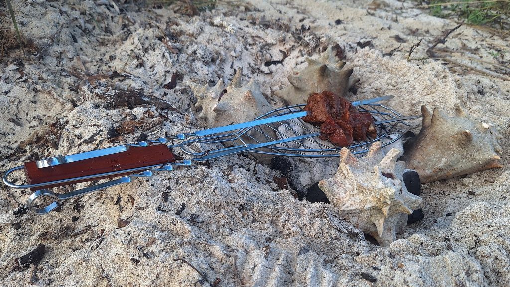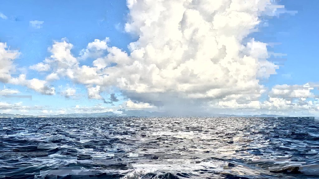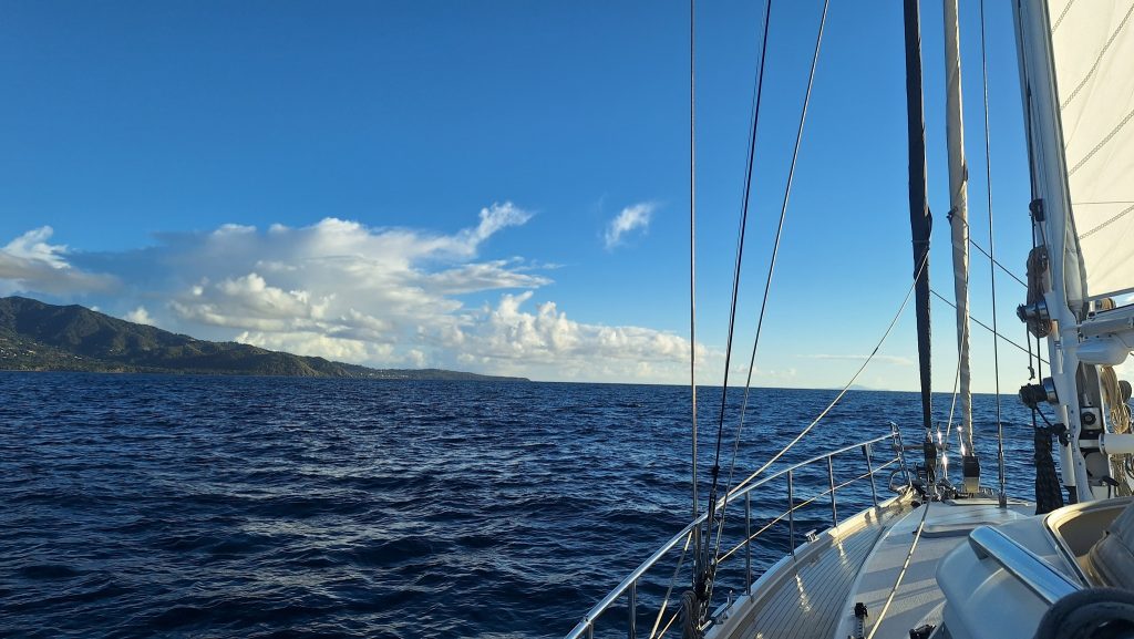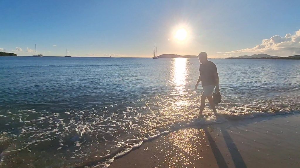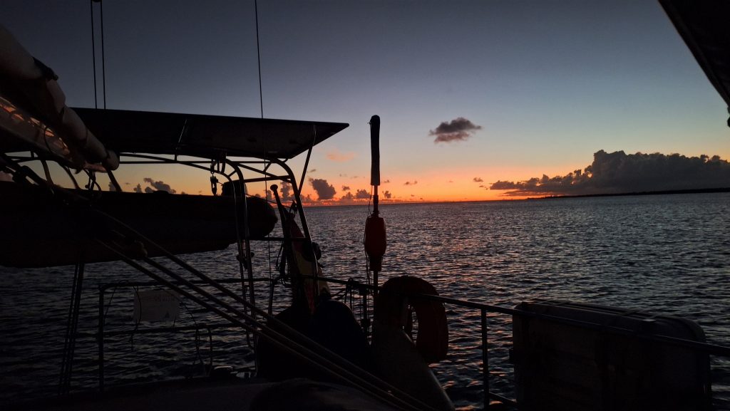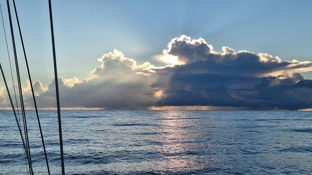 Lisa und Arjen hatten gerufen. Ob wir nicht ein Barbecue am Strand machen wollten? Um fünf sollte das Grilltreffen allerdings abgeschlossen sein, wegen der dann anstürmenden Mosquitos. Wir waren gerne dabei, wollten aber nichts essen, da uns ein um fünf Uhr abgeschlossenes Essen zu früh erschien. Getränke hatten wir natürlich eingepackt.Überrascht stellten wir fest, dass nur wir vier die Strandparty bestritten. Vielleicht als Dankeschön für das Tauchshirt, das Anke Lisa geschenkt hatte. Anke saß es zu lose, Lisa passte es. – Und wie gesagt, wir wollten ja nicht essen. – Doch die beiden hatten so viel mit, dass wir in gewissem Umfang zum unterstützenden Verzehr genötigt wurden.Arjen grillt bevorzugt in kleinen Sandlöchern auf Spießen. Das erfordert nur wenig Grillkohle und ist sehr effektiv. Hier wird das Feuer von Schalen der Fechtermuschel gefasst. Nach dem Grill entfernt Arjen jegliche Asche vom Boden und entsorgt sie, um zu verhindern, dass schwarzes Substrat in den Sand gelangt. Der würde in der Folge bei intensivem Sonnenschein barfuß unbetretbar! An diesem Verhalten erkennt man, dass die beiden in ihrer Berufstätigkeit viel Erfahrung mit der touristischen Lebenswirklichkeit in der Karibik sammeln konnten.Nach unverdient erhalten Essensanteilen sollst Du tausend Schritte tun oder ruhn. Die Wahl fällt leicht.Tolle Stimmung und tolle Lichtstimmung am Ende des Tages.Fast täglich erleben wir eine solche Abendstimmung. Mal mit mehr, mal mit weniger Wolken. Bei genauem Hinsehen erkennt man zwei Wracks. Überbleibsel des Hurricane Maria von 2017. Das Jahr 2017 war ein Jahr größter Wirbelsturmaktivität. Maria war der achte Hurricane in jenem Jahr und der zweite der Kategorie 5, der höchsten Kategorie. In Puerto Rico erforderte er 2.975 Todesopfer. Insgesamt über 3.000. Bei diesen Zahlen wird man sehr nachdenklich.Der Morgen danach. Wir haben die Bucht von Salinas mit dem ersten Büchsenlicht verlassen. Eine Schauerwolke lässt uns freundlicherweise rechts liegen. Wir kämpfen uns bei den ruhigen morgendlichen Bedingungen gegen Wind und Strom in die Bucht von Patillas. Ganze 19,5 Meilen, und der echte Gewinn Richtung Osten, den wir uns gutschreiben können, fällt ja noch geringer aus.Abendstimmung bei Patillas.Der nächste Morgen. Wir steuern die östliche Ecke Puerto Ricos an, zunächst mit Maschine und dem Großesegel als Stütz und versuchen mit diesem Setting auch noch Höhe gen Nord gutzumachen als wir rum sind. Dann endlich setzen wir Genua und Besan und beginnen zu kreuzen, anfangs sogar mit unerwartet günstigem Winkel zum Ziel. Doch nach kurzer Zeit drehen die Winde und machen uns zusammen mit den quer setzenden Tidenströmungen zu schaffen. Unser Ziel ist die nahe Nachbarinsel Vieques, die man auf dem Foto ganz zart am Horizont schimmern sehen kann, da wo die Genuaschot den Horizont schneidet.Eine Gopro-Aufnahme, möglicherweise versehentlich entstanden. Sie wirkt, als wäre sie gemalt. Aber wir beteuern, wir haben an der originalen Datei nichts, aber auch gar nichts verändert. Auch wenn es nicht düster dramatisch ist, dramatisch ist die Wolke in jedem Fall und passt zum Fortgang der Ereignisse: Martin entsann sich der quer über der Pantry gehalterten Angel, bei uns nur als Kampfangel tituliert, und fast nie im Gebrauch.