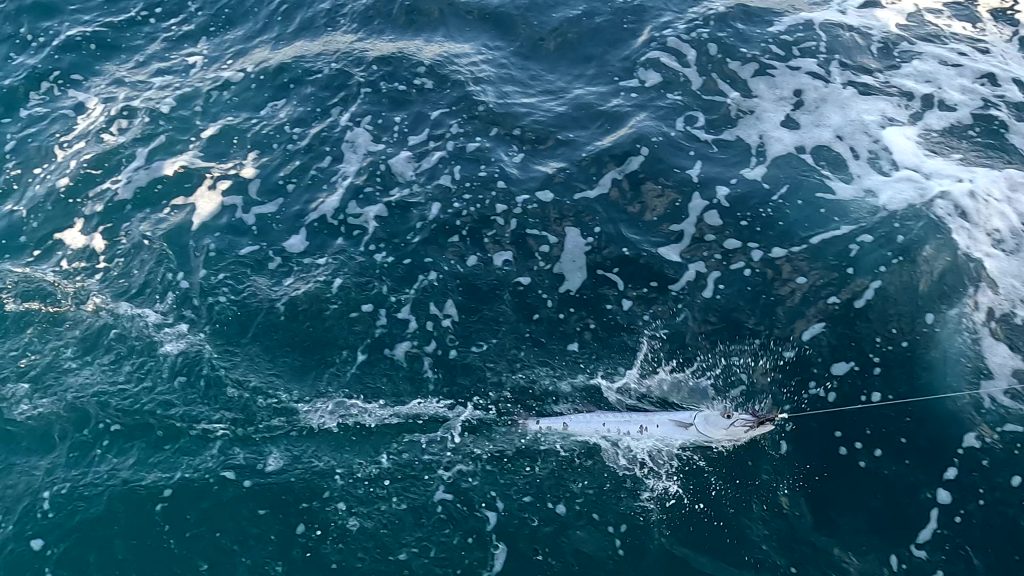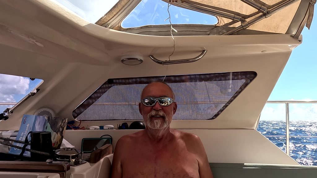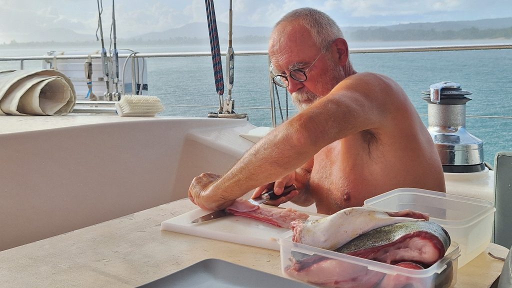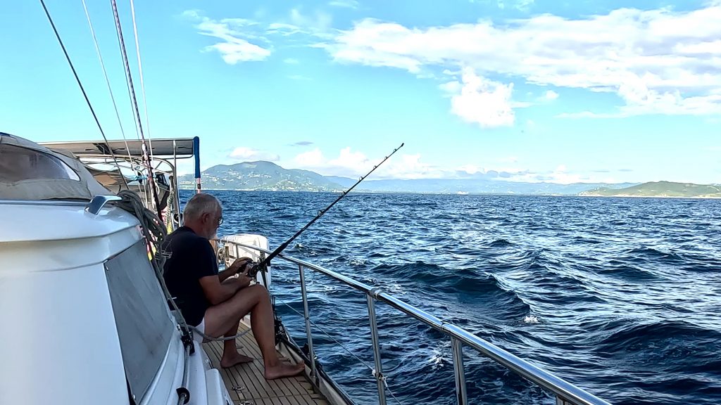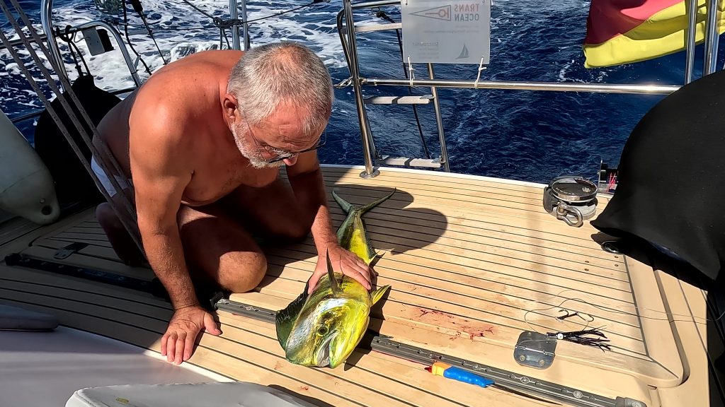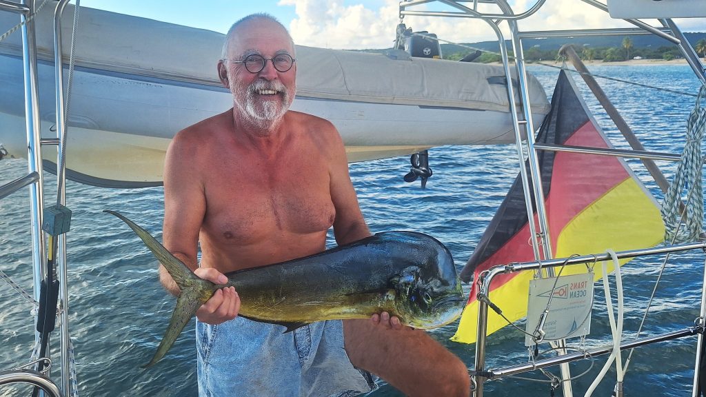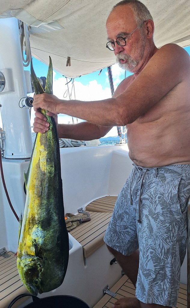 Wenig später sieht man Martin am Seitendeck. Noch ein wenig die Multirolle und die Sehne prüfen. Der Köder, eine dunkellilablaue Tintenfischimitation, badet bereits in den Fluten …… allerdings nicht sehr lange, da gibt es einen kleinen Ruck an der Angel. Nach dem üblichen Hin und Her: „Da ist nichts dran!“ – „Doch, da is was dran!“ – „Ist wieder ab.“ – „Ist doch noch dran!“ usw., hat er nach reichlichem Kampf ohne Bauchgurt, den wir gar nicht haben, den Fang längsseits. Ein 80 – 90 cm langer Barrakuda. Wegen des Risikos an Ciguatera zu erkranken, wollen wir aber keinen Barrakuda, und so holen wir diesen Vertreter kurz an Bord, lösen die beiden Haken und geben ihn zurück in sein Element. Er erzählt jetzt seinen Kumpels sicher so eine Art Jonas-Geschichte.Entspannung. Und Erkenntnis: Kampfangel ohne Bauchgurt ist nix. So ist sie schon wieder in der Pantry gehaltert und der gleiche Köder mit der altbewährten Relingsrolle trotz störenden Dinghis am Heck ausgebracht. Es dauert ein bisschen …… doch dann ratscht die Relingsrolle am Heck los. Mit ihr lässt sich der Fang wesentlich besser ans Boot holen und nach einem kurzen, prüfenden Hebeversuch hole ich den Fang ohne Gaff an Bord. Eine schöne Goldmakrele. Hatten wir den Barrakuda noch in recht flachem Wasser gefangen, bewegen wir uns gerade auf über 1.000m Wassertiefe, also das Richtige für Fische des offenen Ozeans. Mit Hochprozentigem in die Kiemen und einem Stich ins Herz – Anke hat schnell alle erforderlichen Mordutensilien herbeigeholt – versuchen wir das Leiden des Tieres kurz zu halten.ENDLICH ! Endlich ist uns wieder Anglerglück zuteilgeworden. Den letzten Fisch hatten wir in der Biskaya gefangen, einen schönen Hornhecht. Mann, wie lange ist das her! 2021 war das. Das darf man gar nicht laut sagen. Seitdem nichts. Absolut nichts, wenn man mal von einem abgehakten Wahoo absieht. Reichlich unkooperativ, dieses Fischvolk. Daher besteht Anke auch auf einem Stolzfoto.