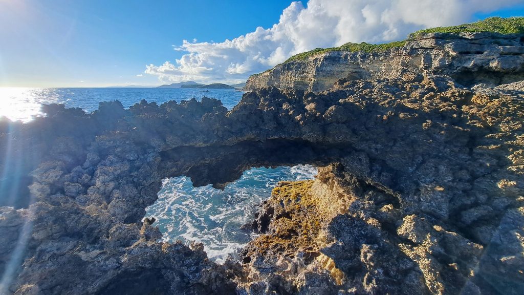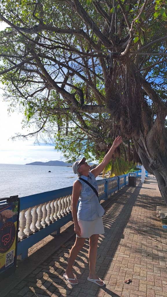 Von der Sun Bay aus wandern wir ein wenig umher. Angenehmerweise häufig unter schattenspendenden Gehölzen.Wir sind nicht die einzigen Freunde des angenehmen Halbschattens. Auf unserem Weg begegnen uns erstaunlich zahlreich verschiedene Einsiedlerkrebse. Oft sehr intensiv gefärbt.Ohne WorteKleine Kletterei. Man gönnt sich ja sonst nichts. Eine Tour über spitziges und scharfkantiges Vulkangestein hat Martin auf diesen Felsen gebracht. Wieder heil zurück, kommentiert er: „Das Malpaís auf Lanzarote ist eine Autobahn dagegen.“Was auf dem vorigen Foto nicht zu erkennen ist, dieser Felsbogen. Ich stehe auf dem von Anke aufgenommenen Foto etwas daneben und habe mich gehütet, den Bogen zu betreten. Bei einem Kollaps wäre es 8-10m in die Tiefe gegangen, mit Aufprall auf wunderschönem Vulkangestein. Ne, nee.Am Übergang vom Vulkangestein zu Korallensedimenten begegnen uns dickblättrige Pflänzchen, die uns an unsere heimische Flora der Watten und Salzwiesen erinnern.Zurück in unserer Sonnen-Bucht – wir wollten den Abfall loswerden, und freundlicherweise ist die ganze Bucht wie auch ihre Nachbarn dicht mit Abfalltonnen ausgestattet. Die Sun Bay bietet einen wunderbaren Strand, an der im Schatten der Palmen hier und da ein paar Einheimische sitzen, oder auch Touristen, meist aus Festlands-USA.Aus einer Domino spielenden Herrengruppe werde ich von einem verkrautetem Guy angesprochen. „Eimscheeloarfrmaschschet.“ Auf Nachfrage verdeutlicht sich, dass uns ein Segler aus Massachusetts anspricht. Wir unterhalten uns freundlich – sie haben schon erkannt, dass wir zur deutschen Yacht gehören – und bekommen spontan das Angebot, wenn wir ein Auto zum Supermarkt bräuchten, sollten wir nur gleich Bescheid sagen. Hier schlendere ich nach dem Gespräch mit dem Massachusetts-Guy befreit vom Müll durch die freundlichen Wellen am Strand.In der Sun BayEsperanza in der Nachbarbucht ist ein sehr verschlafenes Nest. Wir laufen hier in der Siesta-Zeit herum. Außer zwei, drei Bars / Restaurants, ein paar Imbißbuden sowie Veranstaltern für Ausflüge in die Mosquito Bay gibt es hier so ziemlich nichts. Und alles schläft.