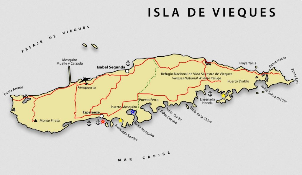 Die Insel Vieques. Gelbe Sternchen markieren unsere Ankerplätze in der Ensenada Sun Bay, hier Ensenada Sombe genannt, und in der Ensenada Honda. Die zu querende Barre befindet sich etwa dort, wo das Ankerzeichen über Ensenada Honda platziert ist. Ansonsten ist die Bucht durch Flachs und Riffe abgeschirmt. Der blaue Stern markiert die Bioluminiscens Bay und der rote Stern das Yacht-Ankerfeld vor Esperanza. (Quelle: https://commons.wikimedia.org/wiki/File:Map_of_Vieques_%28non.political%29.png, vom Verf. bearbeitet.)