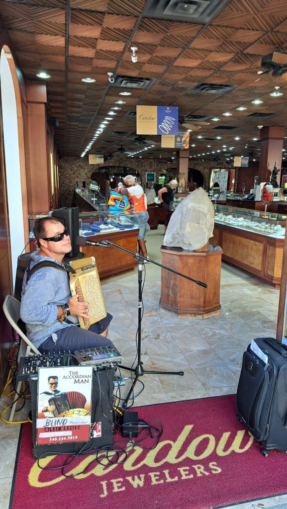 Hier wird einem blinden Musiker gestattet, sein Einkommen im Eingang eines Juweliergeschäfts zu generieren.