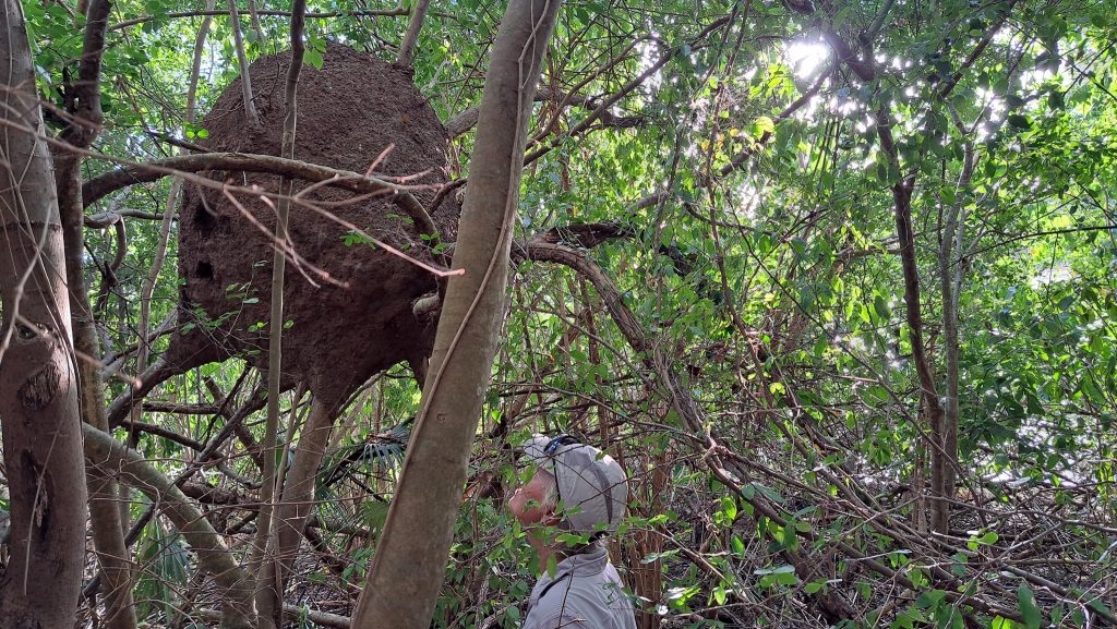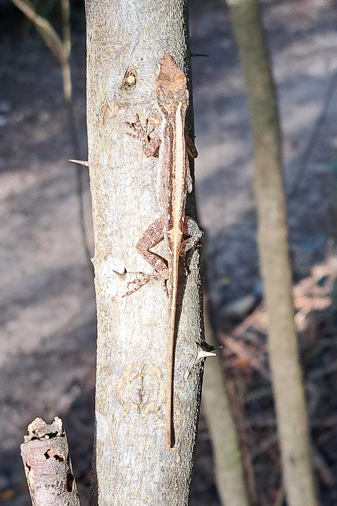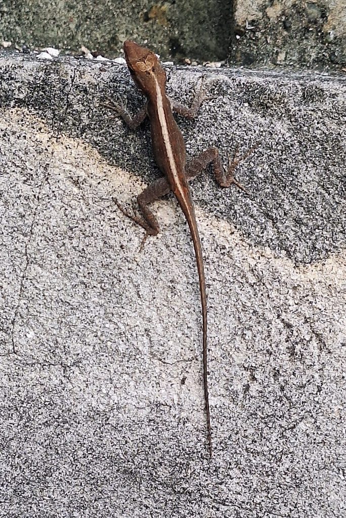 Mit dieser Echse haben wir mal wieder unsere liebe Mühe. Es gibt mehrere Spezies mit einem hellen Rückenstreifen, und wir haben noch keine überzeugende Antwort gefunden, welcher Art wir hier wirklich begegnet sind.